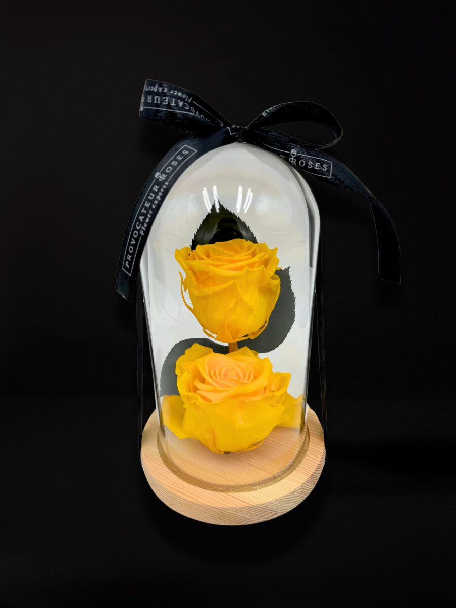 La belleza atemporal se encierra en esta cúpula amarilla, donde dos rosas preservadas de calidad excepcional se presentan como un símbolo de amor infinito. Cada rosa ha sido cuidadosamente seleccionada y tratada mediante un proceso 100% natural que mantiene su frescura y esplendor durante años, sin necesidad de agua ni luz solar.