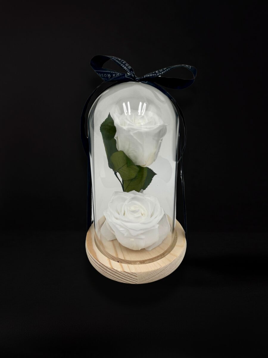 Dos rosas eternas blancas en una cúpula de cristal con base de madera. Un símbolo de pureza y elegancia que perdura en el tiempo sin necesidad de cuidados.
