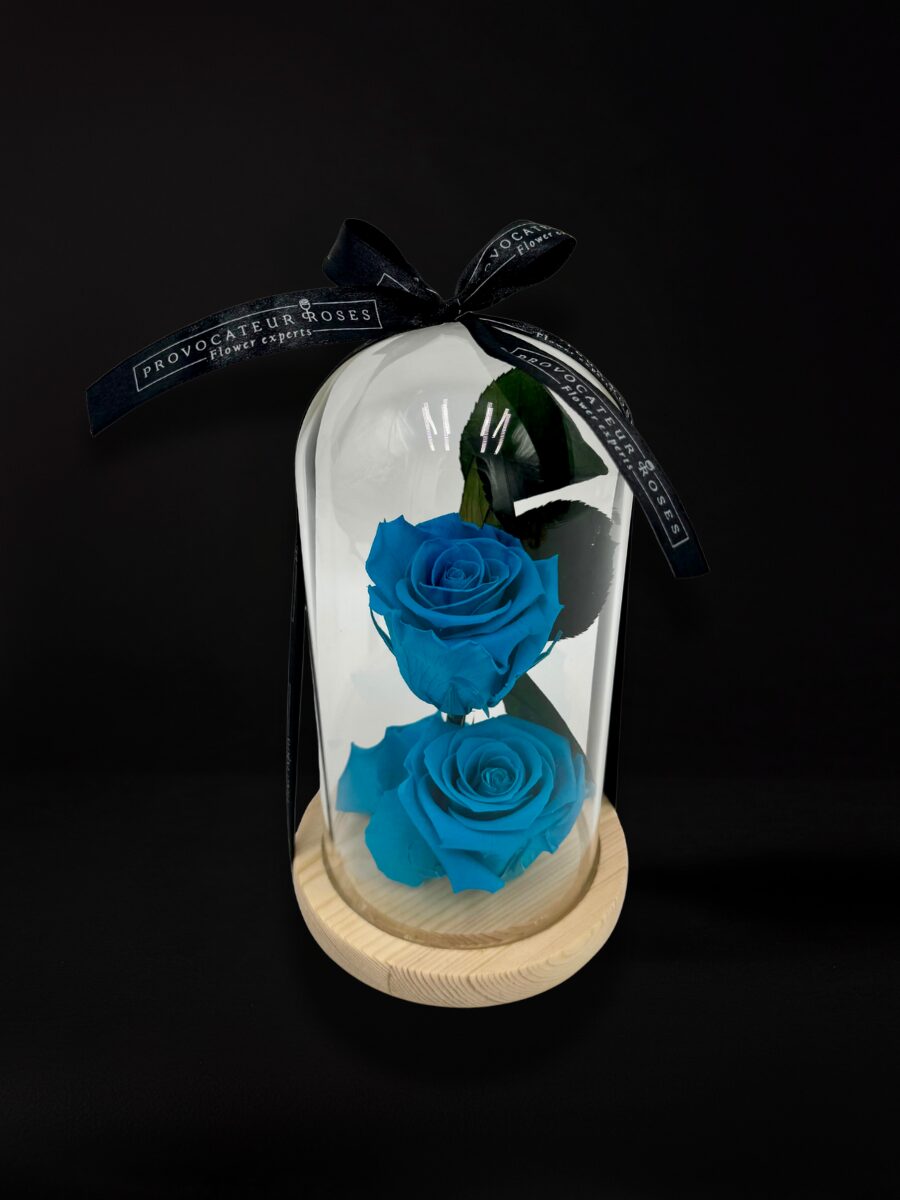 Dos rosas eternas en azul turquesa, resguardadas en una cúpula de cristal con base de madera. Un símbolo de armonía y exclusividad que perdura en el tiempo sin necesidad de cuidados.