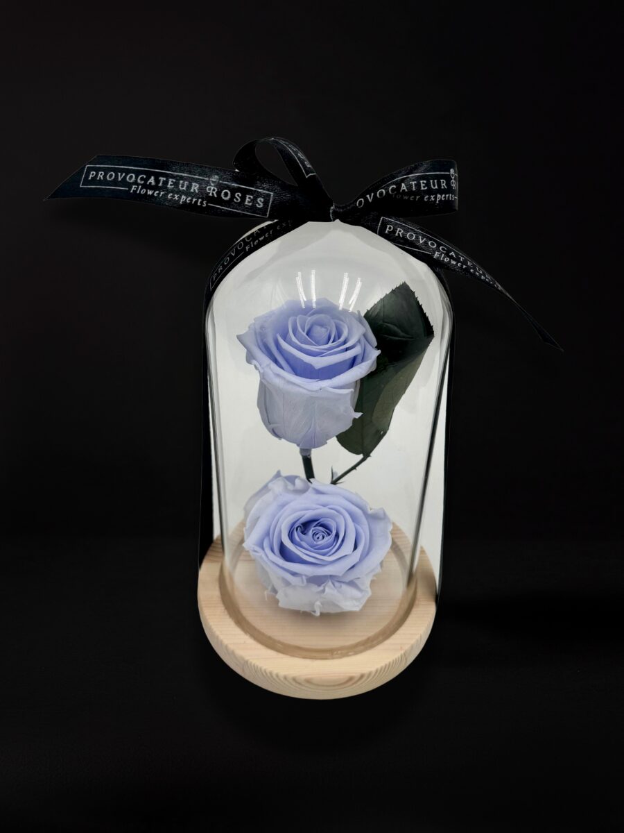 Dos rosas preservadas en un elegante tono lila, presentadas en una cúpula de cristal con base de madera. Un diseño sofisticado que transmite calma, delicadeza y un encanto atemporal.
