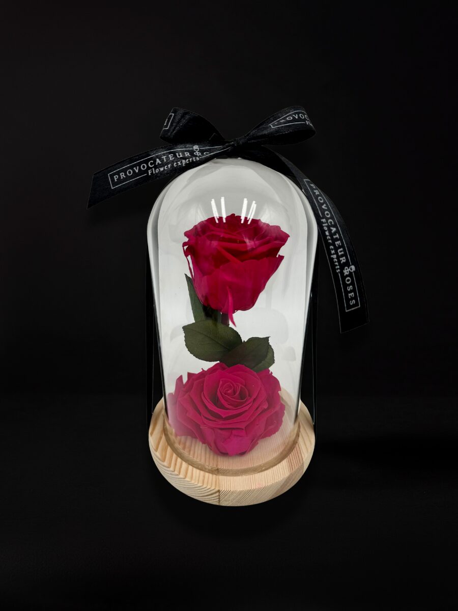 El rosa representa dulzura, gratitud y amor sincero, y estas dos rosas preservadas capturan esa esencia en una pieza floral única. Seleccionadas cuidadosamente y sometidas a un proceso 100% natural, estas rosas se mantienen perfectas durante años sin necesidad de agua ni luz. Su presentación en una elegante cúpula de cristal con base de madera las convierte en el regalo ideal para transmitir cariño, afecto y sofisticación en una misma pieza.