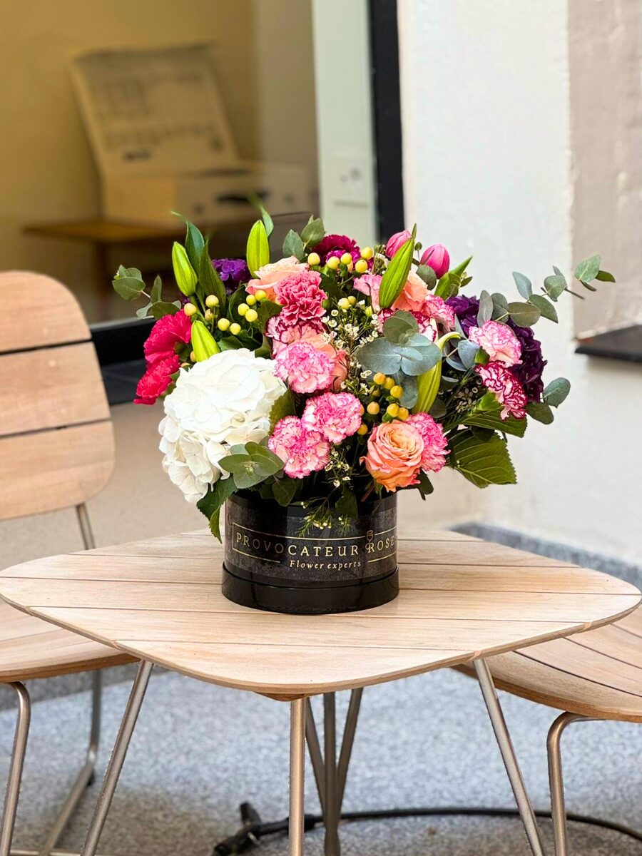 Afrolinda es una creación floral que combina la intensidad de los colores vivos con la suavidad de flores delicadas. Hortensias blancas, claveles en tonos rosados, rosas elegantes, lisianthus, tulipanes y verdes se entrelazan en una caja negra sofisticada que resalta aún más la belleza natural del conjunto.