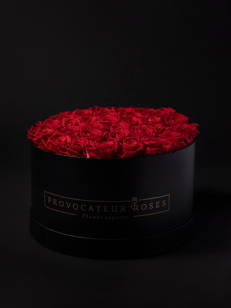 Esta caja negra de diseño premium guarda un arreglo de rosas rojas frescas, elegidas por su belleza y aroma.