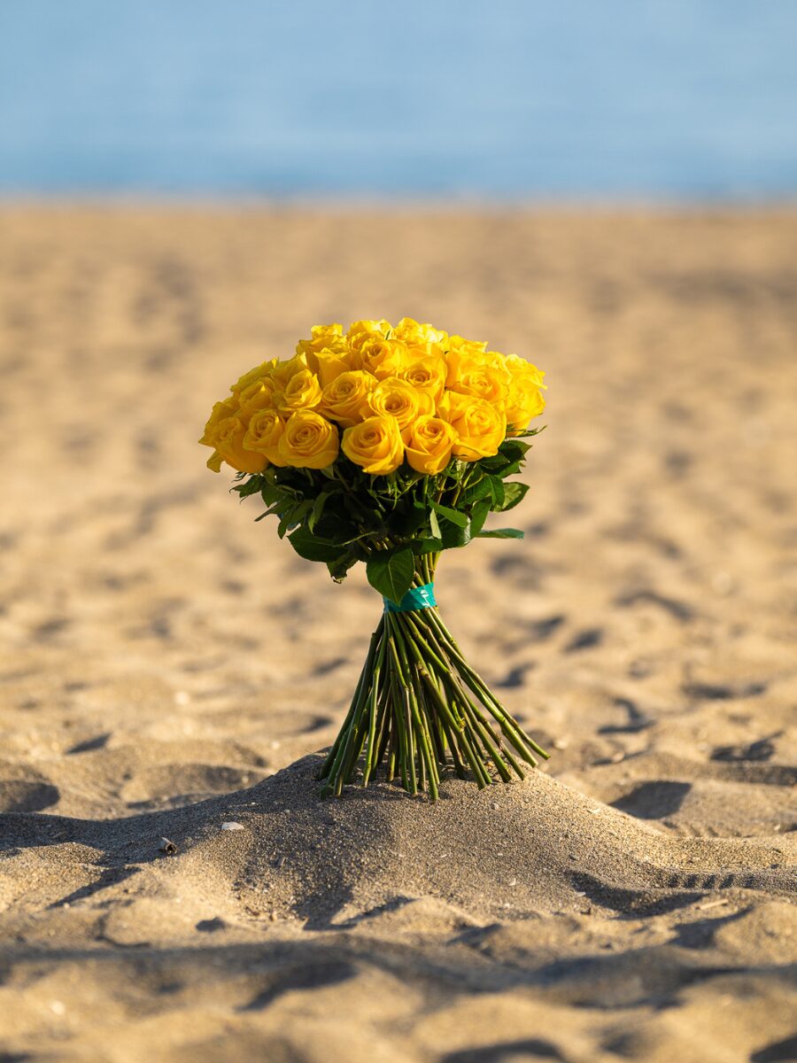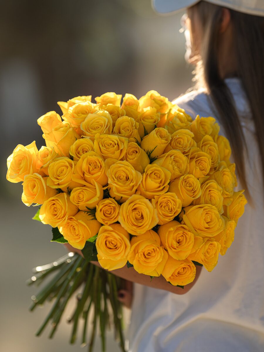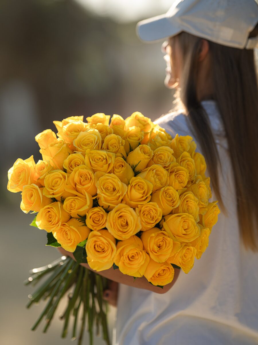 Un ramo impactante formado por 50 rosas amarillas frescas, cuidadosamente seleccionadas para transmitir energía positiva y vitalidad. Su color radiante evoca la calidez del sol y la frescura de los días luminosos, convirtiéndolo en una elección perfecta para quienes desean sorprender con un detalle lleno de vida y elegancia.