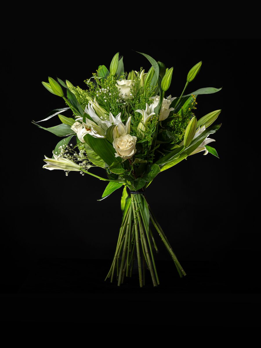 Un homenaje a la pureza y la serenidad. El bouquet de lilium y rosas blancas combina la majestuosidad de los lirios con la delicadeza de las rosas, creando una composición equilibrada que transmite paz, amor y respeto. Su aroma suave y su presencia armoniosa lo convierten en una pieza ideal para expresar sentimientos sinceros y duraderos.