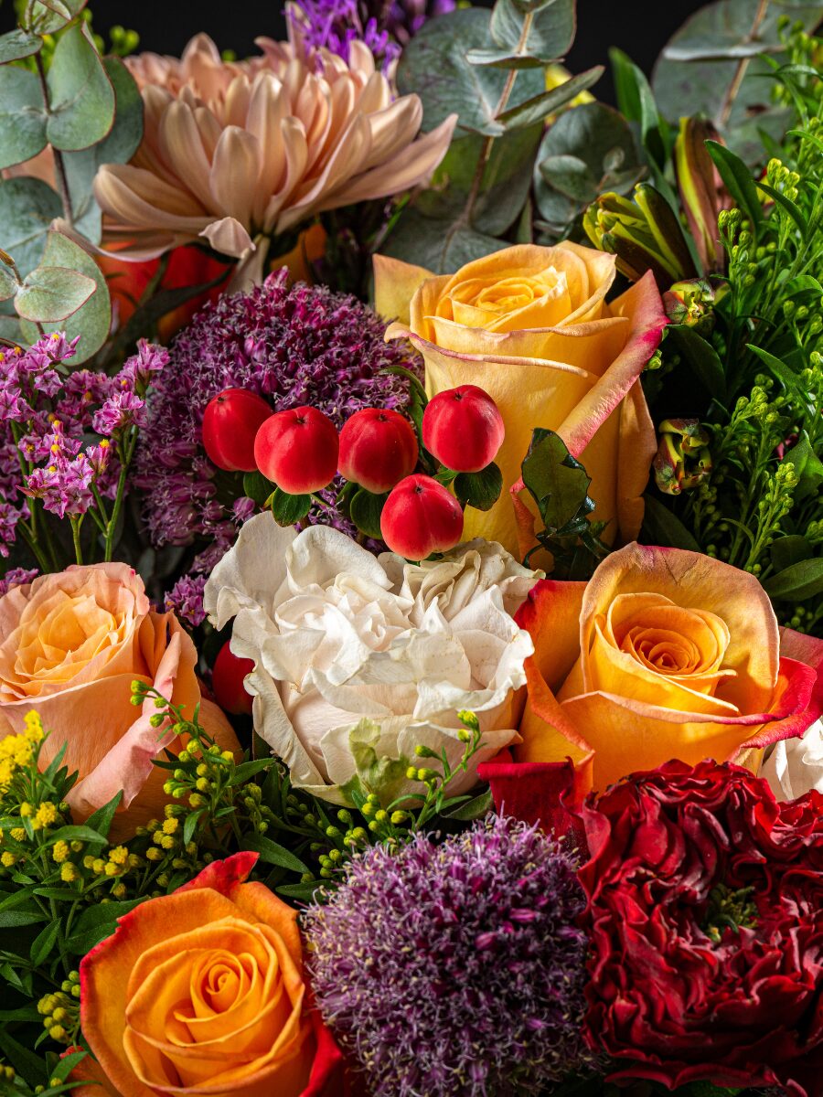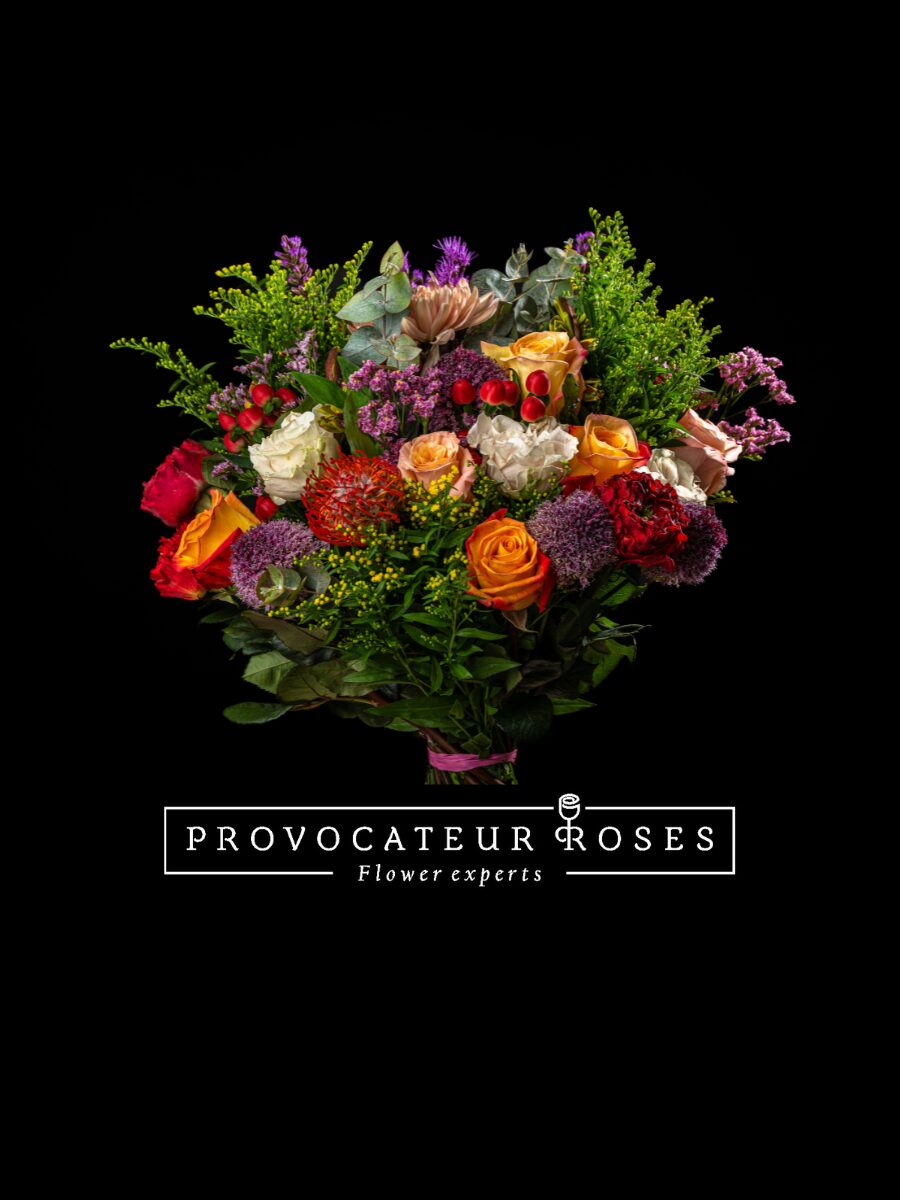El Bouquet Misterio es una composición floral envolvente y sofisticada, donde los tonos intensos y cálidos se entrelazan en perfecta armonía. Rosas de distintos matices, proteas exóticas y limonium aportan profundidad y textura, mientras que el solidago y el hipéricum añaden luz y contraste. Cada flor fue elegida para evocar el encanto de lo desconocido y la belleza de lo inesperado.