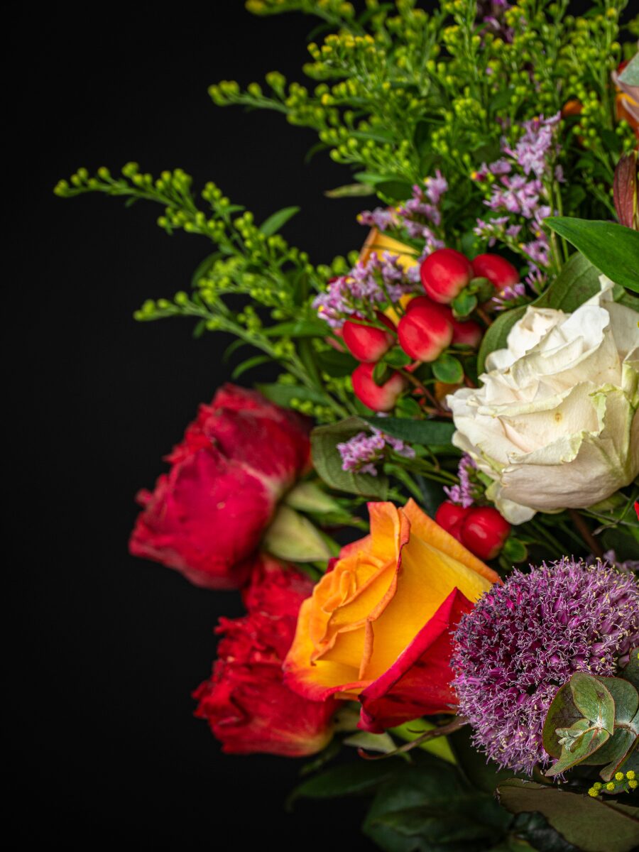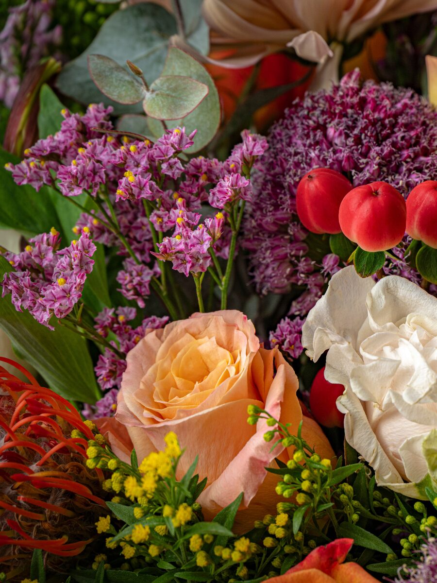 ✔ Flores: rosas, protea, solidago, hipéricum, limonium y follaje natural