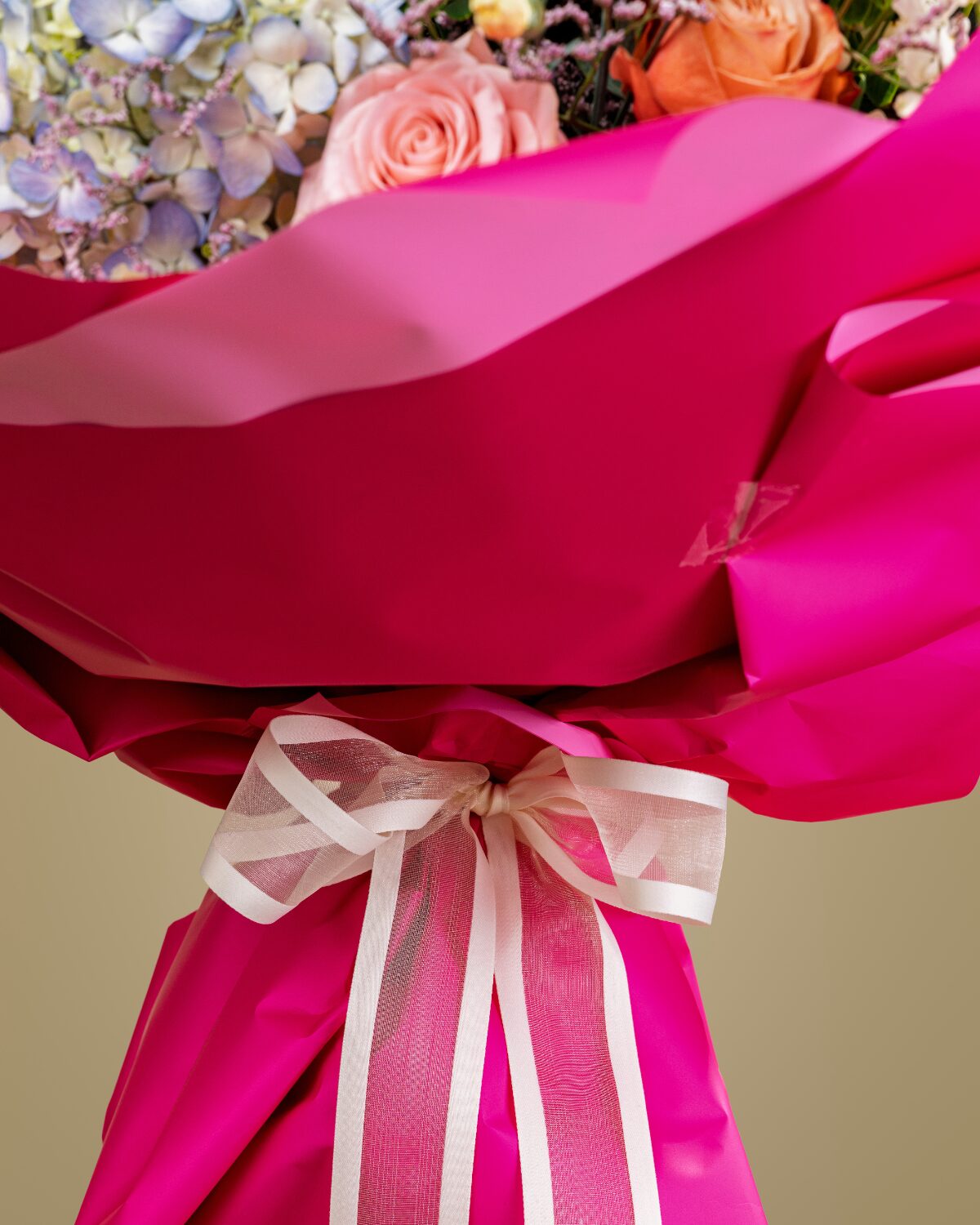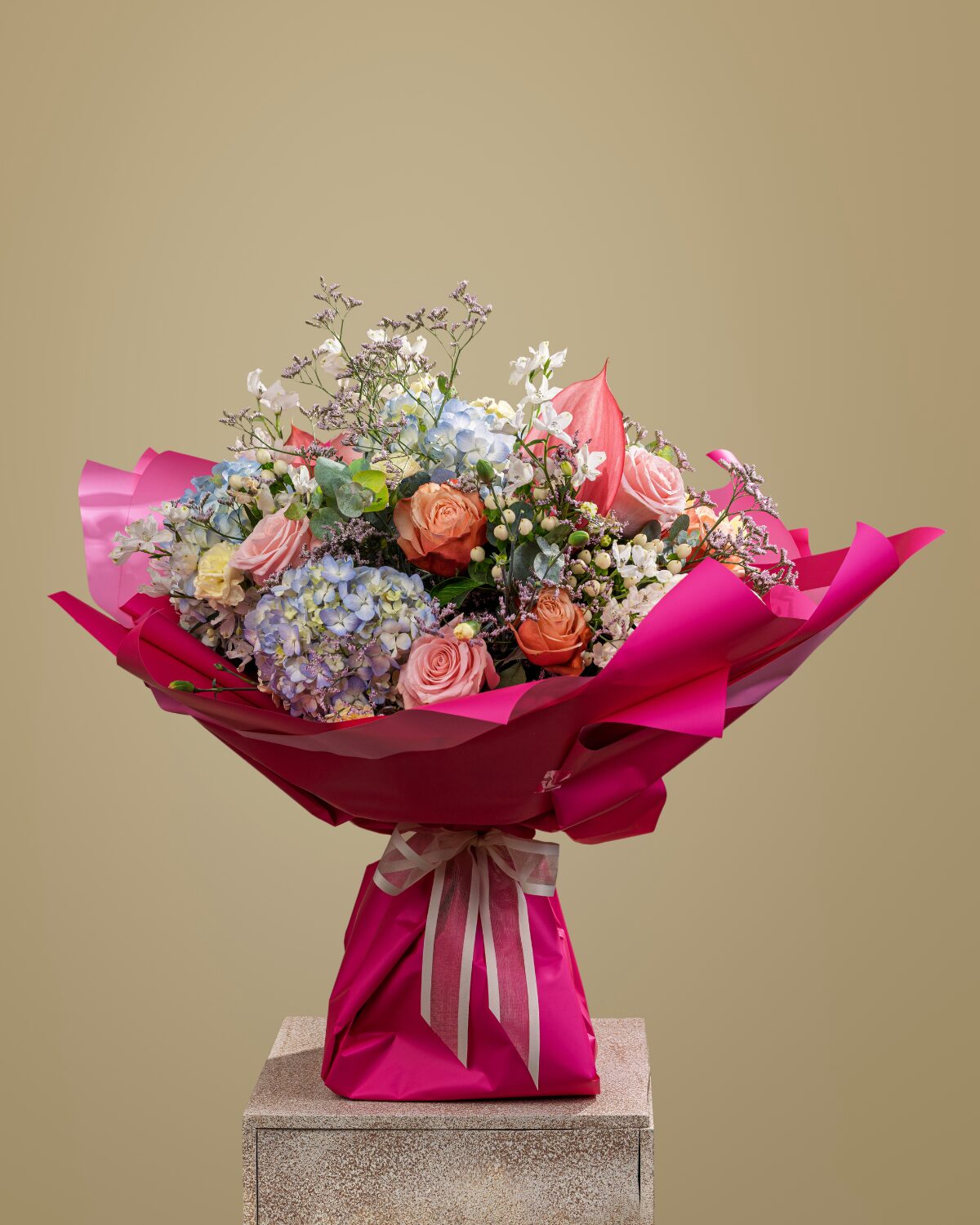 Este bouquet reúne hortensias, rosas, limonium, delfinium, hypericum, anthurium y verdes frescos, envueltos en un elegante papel fucsia brillante. Una composición que transmite vitalidad, ternura y energía positiva, ideal para celebrar momentos especiales con color y elegancia.