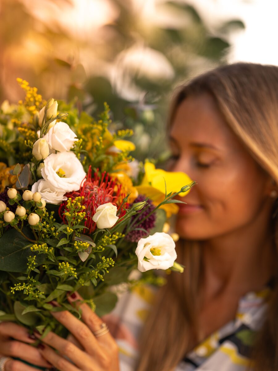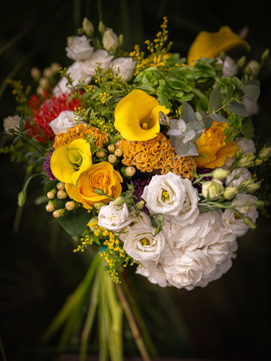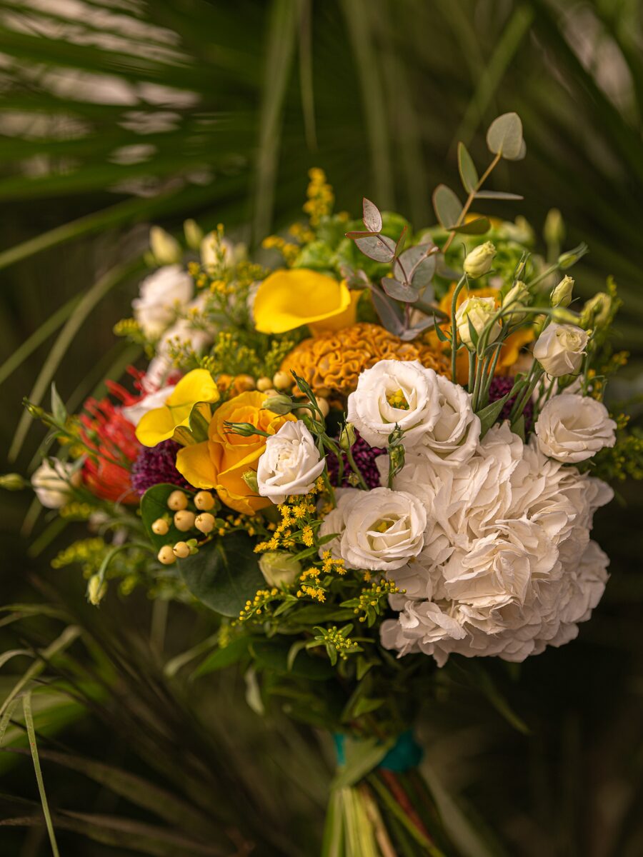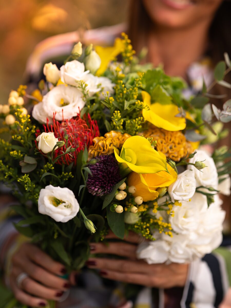 Un ramo vibrante y equilibrado que combina hortensias majestuosas, rosas románticas, lisianthus delicados, solidago dorado, proteas exóticas, hypericum luminoso, celosías con textura única y verdes frescos que realzan la composición. Una creación cálida y envolvente que invita a detenerse y disfrutar de la belleza natural en su máxima expresión.