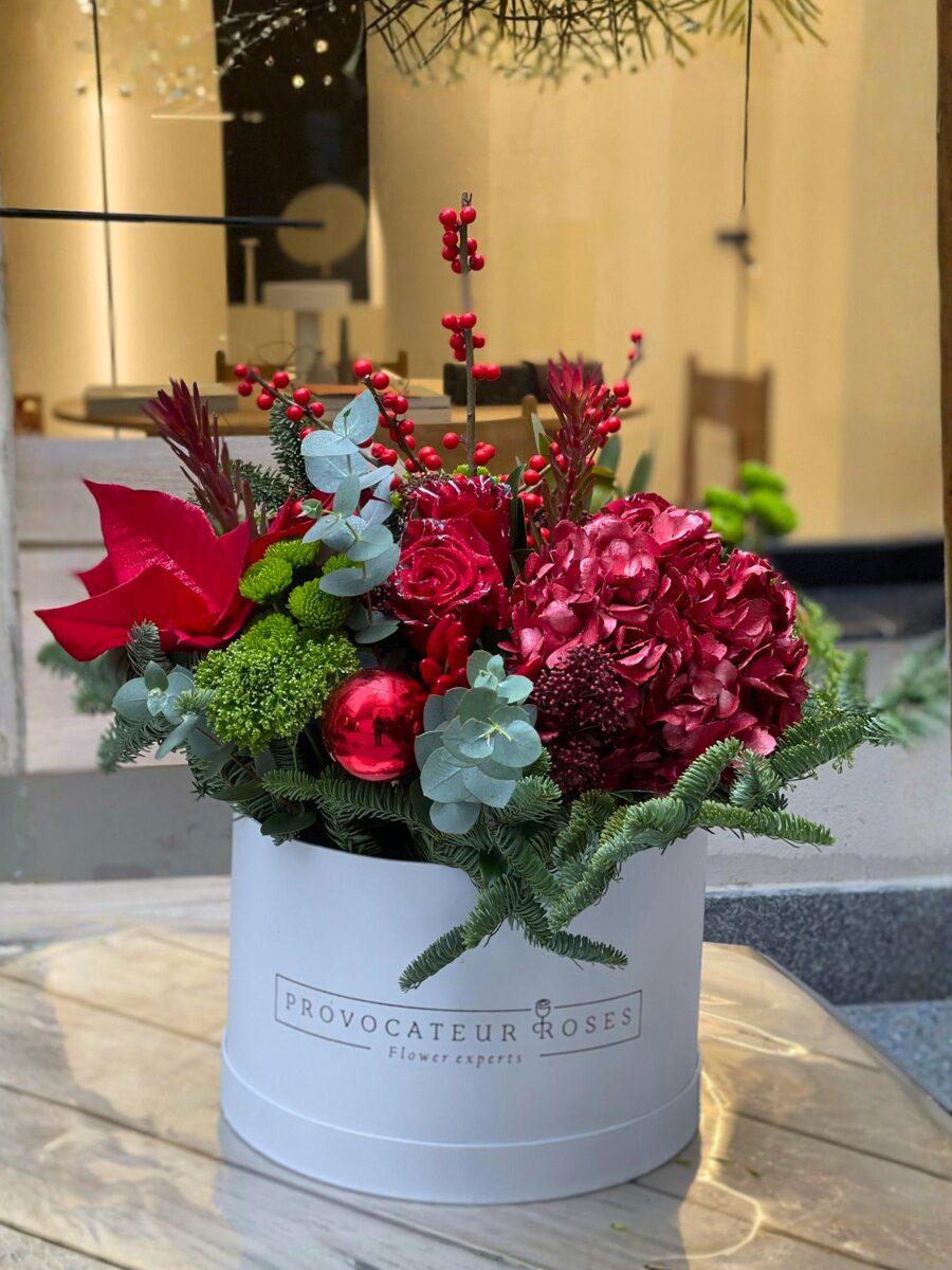 Las flores en tonos rojos profundos —como la hortensia burdeos, las rosas y el amarilis— se mezclan con el brillo suave de adornos navideños, ramas de ilex y verdes nobles que aportan volumen y frescura. Cada elemento ha sido seleccionado para crear una composición equilibrada, elegante y con ese toque mágico que define la temporada más especial del año.