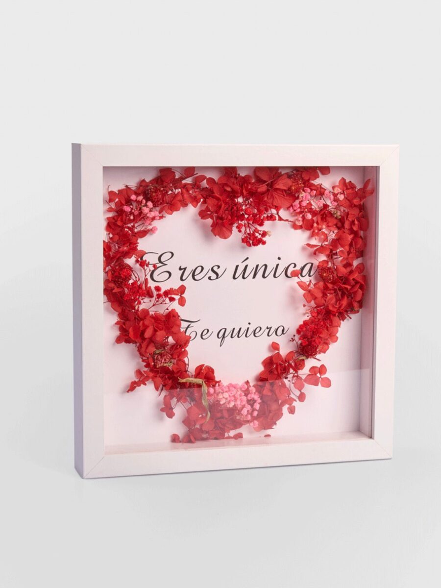 El Cuadro “Eres Única” es una creación pensada para decir mucho con muy poco. En su interior, la flor preservada forma un corazón que enmarca un mensaje íntimo y directo, dando lugar a una composición equilibrada, elegante y cargada de significado.