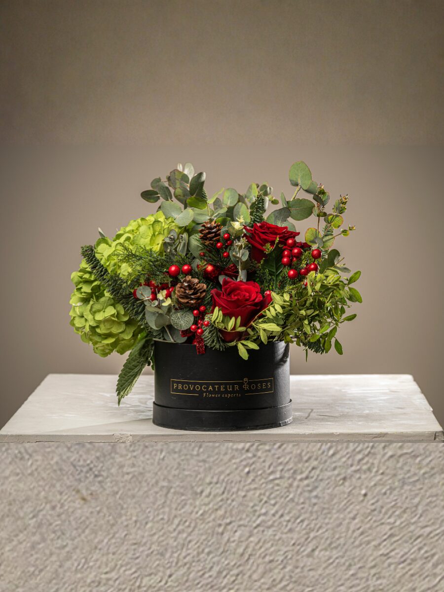 Este arreglo destaca por la fuerza de las rosas rojas aterciopeladas, símbolo de amor y celebración, acompañadas de una hortensia verde premium, cuya tonalidad fresca aporta luz y un contraste espectacular. El conjunto se envuelve en eucalipto, ramas de abeto natural, hojas verdes decorativas y el detalle cálido de piñas naturales.