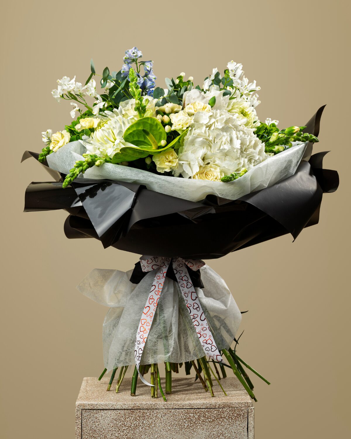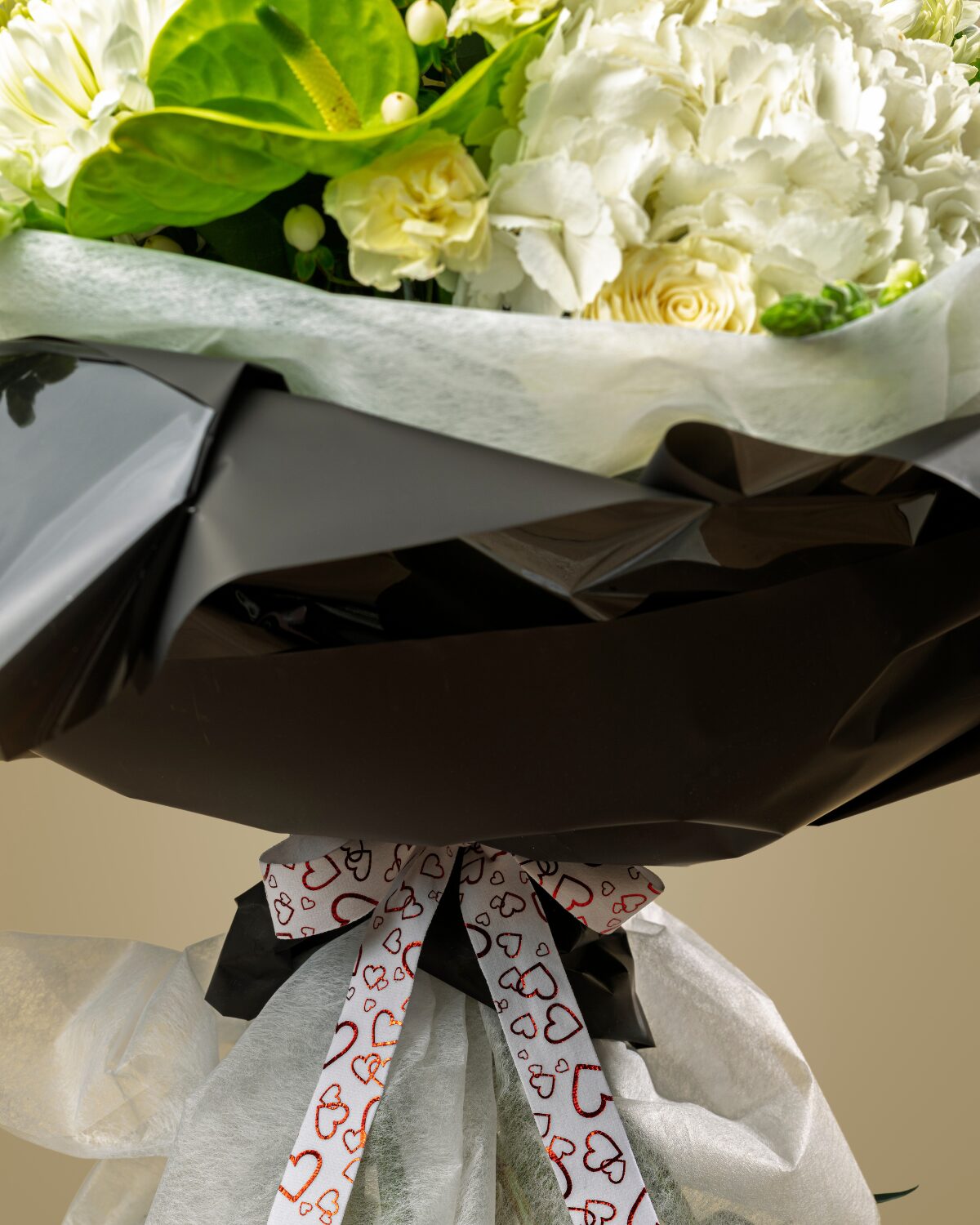 Este bouquet combina flores blancas y verdes en un diseño elegante y moderno. Envuelto en papel negro y blanco, transmite pureza, serenidad y carácter, ideal para quienes buscan un detalle con estilo refinado y atemporal.