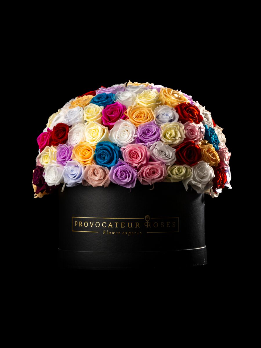 Cada rosa, preservada con excelencia, mantiene intacta su belleza y frescura con el paso del tiempo. La armonía entre los colores crea un efecto visual único, transmitiendo sentimientos de amor, amistad, gratitud y celebración en un solo arreglo. El contraste con la caja negra resalta aún más la intensidad cromática de este diseño.
