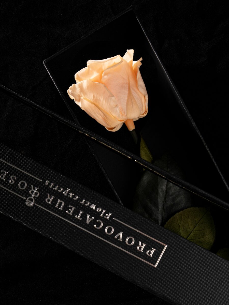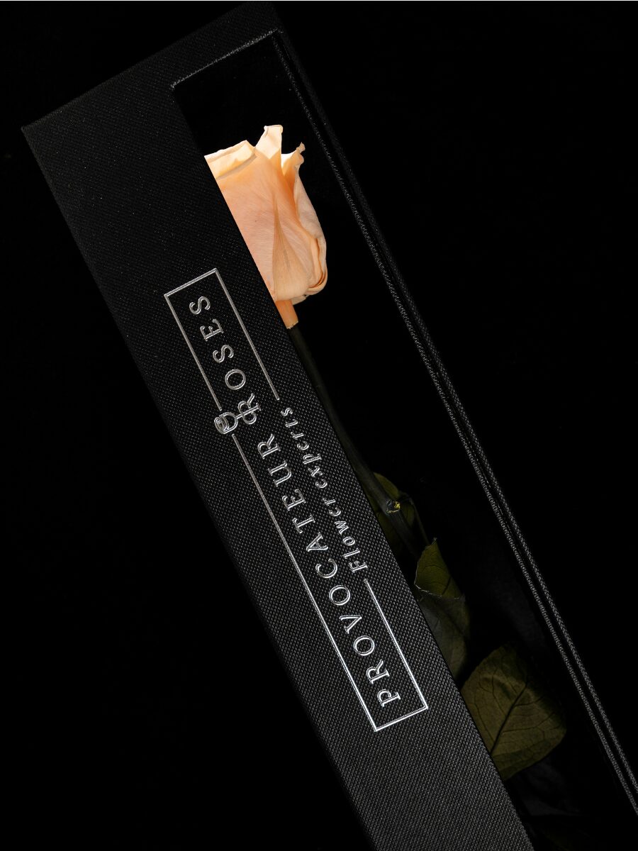 La Eternity Peach Nectar Rose irradia calidez, optimismo y sofisticación. Su tono melocotón simboliza la gratitud, la alegría y los nuevos comienzos, evocando los primeros rayos de sol sobre una mañana tranquila. Presentada en un estuche negro con cinta satinada, esta rosa preservada combina la frescura del color con la elegancia del diseño minimalista de Provocateur Roses.