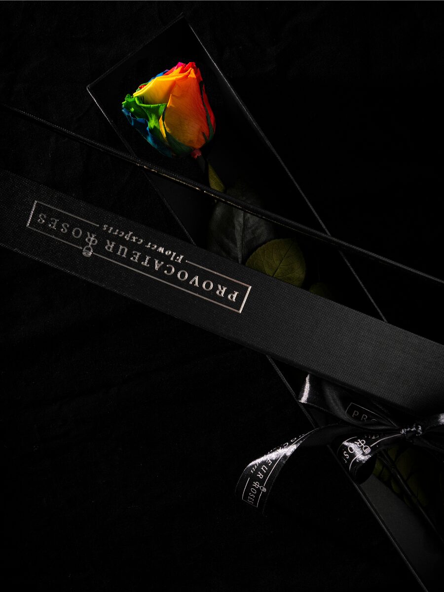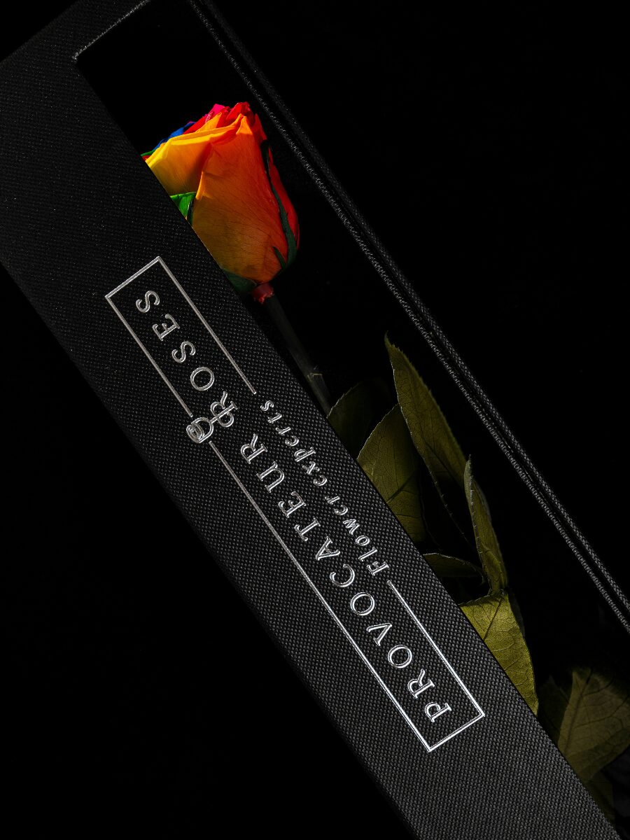 Gracias a su meticuloso proceso de preservación, la Eternity Rainbow Rose mantiene su textura natural y su esplendor cromático durante años. No requiere agua ni mantenimiento, solo el deseo de conservar la magia de los colores vivos para siempre.