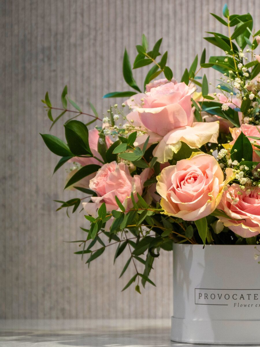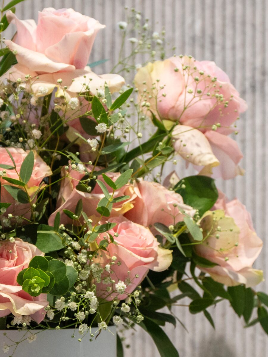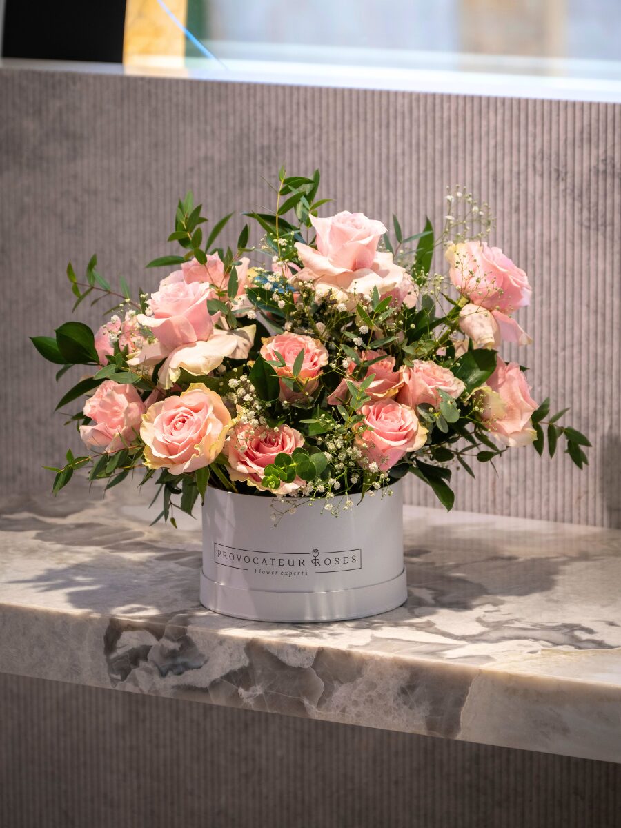 Una caja elegante de 20 cm que reúne la delicadeza de 15 rosas frutteto, acompañadas de verdes naturales que realzan su belleza.