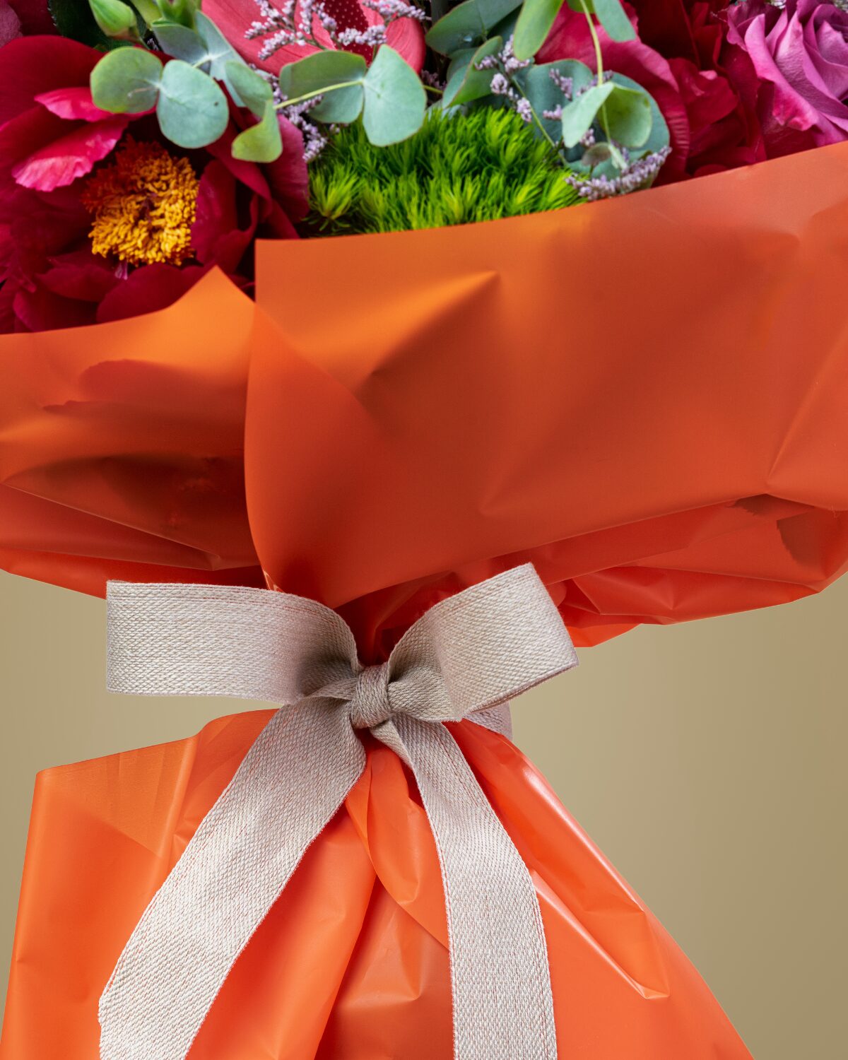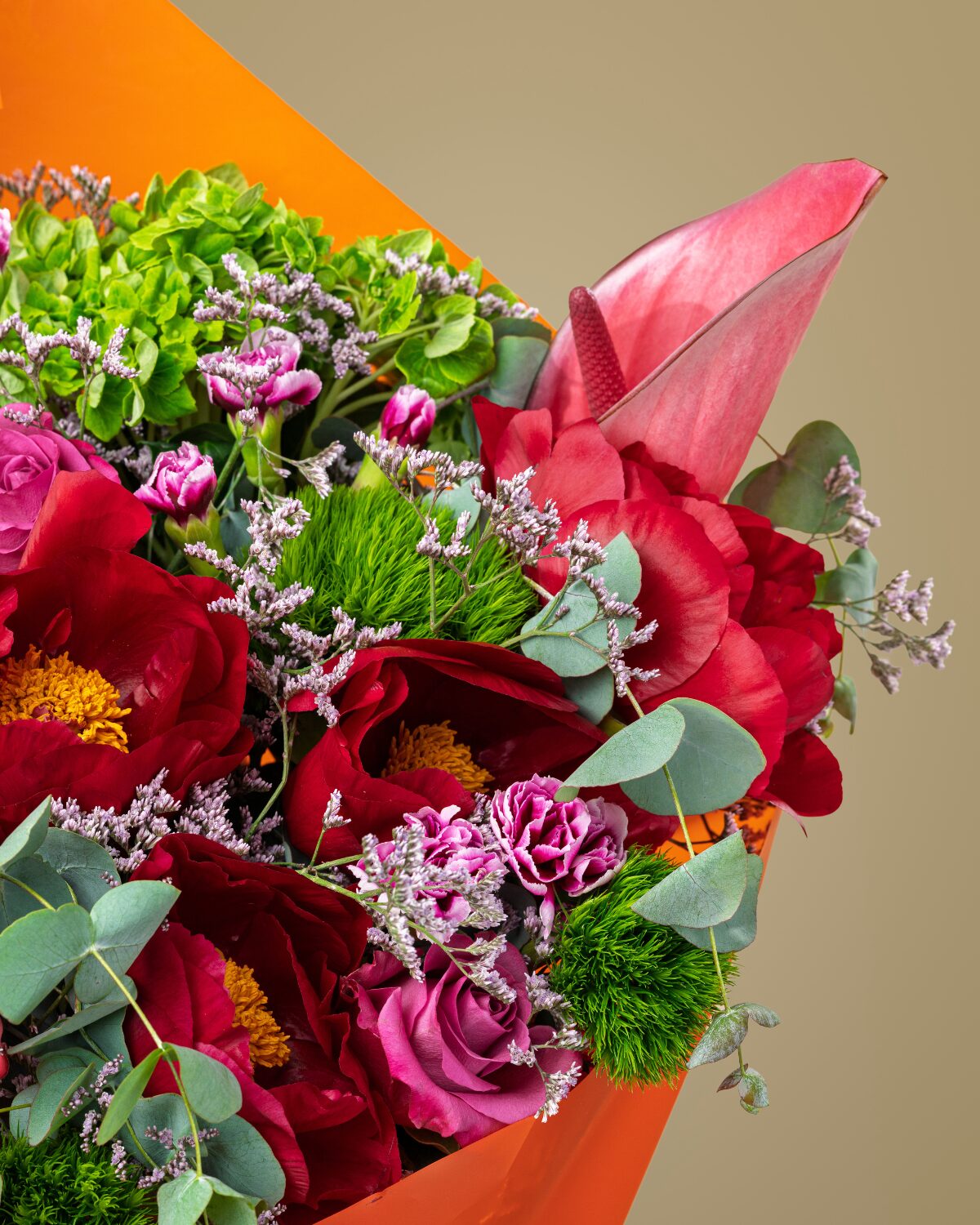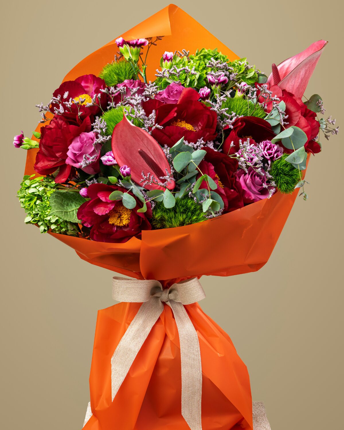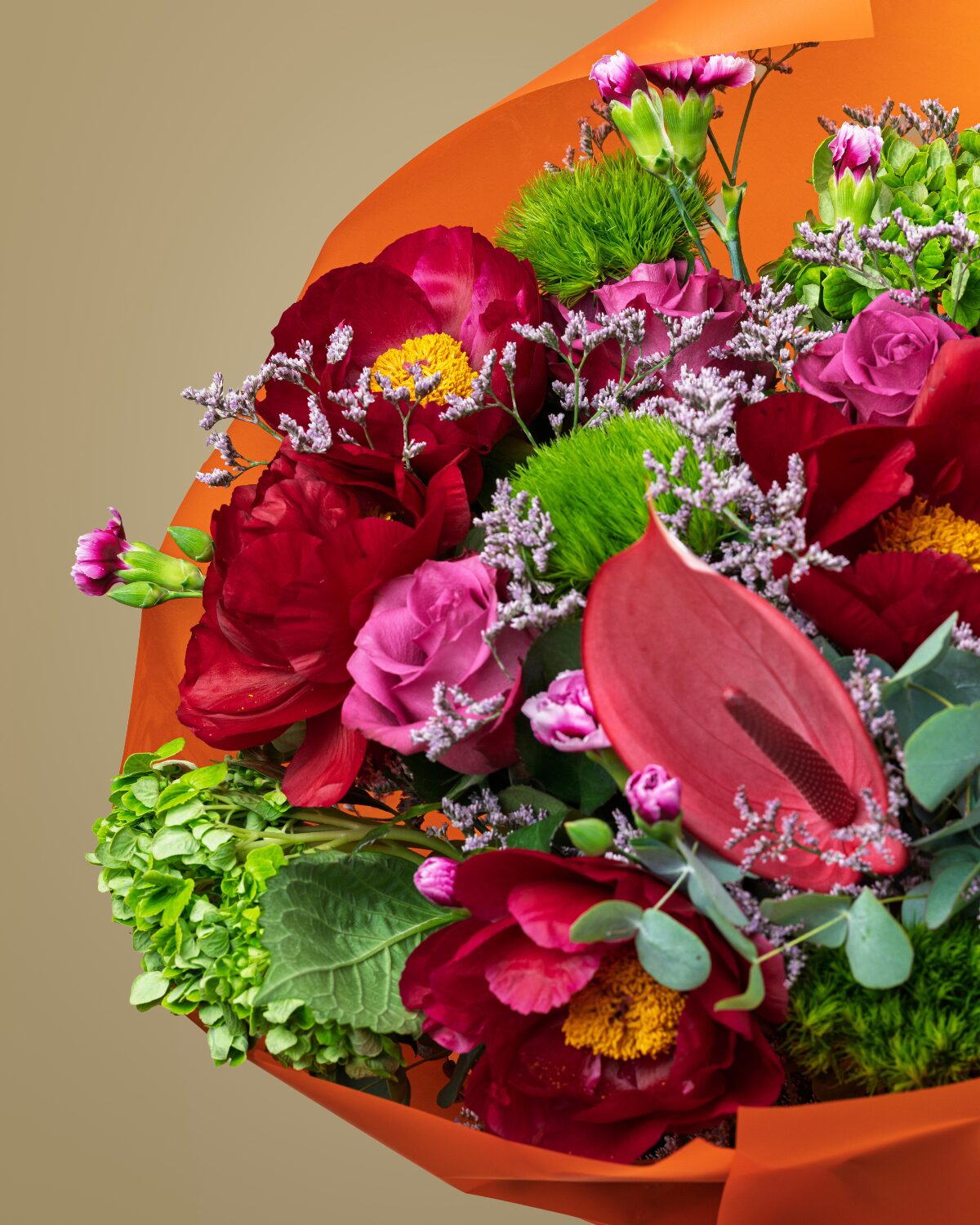 Este bouquet combina peonías granates, claveles verdes, rosas deep purple, hortensias, mini claveles, anthurium y delicados verdes, envueltos en un papel naranja vibrante que resalta su personalidad. Una propuesta floral llena de fuerza, elegancia y frescura, ideal para sorprender con estilo.