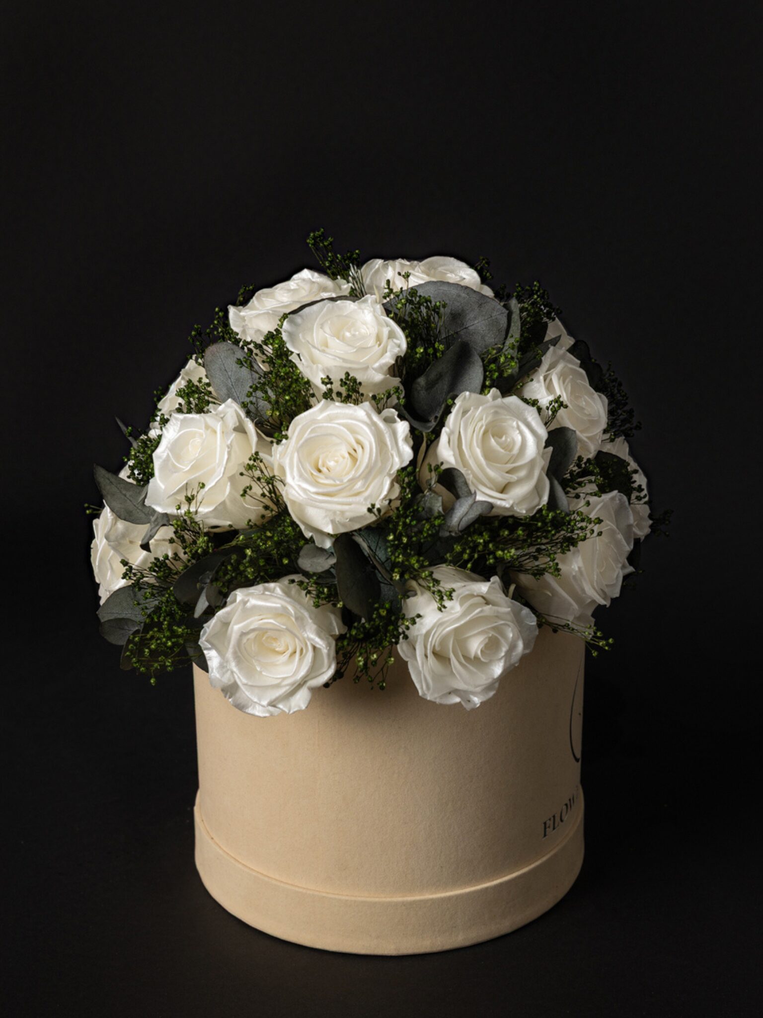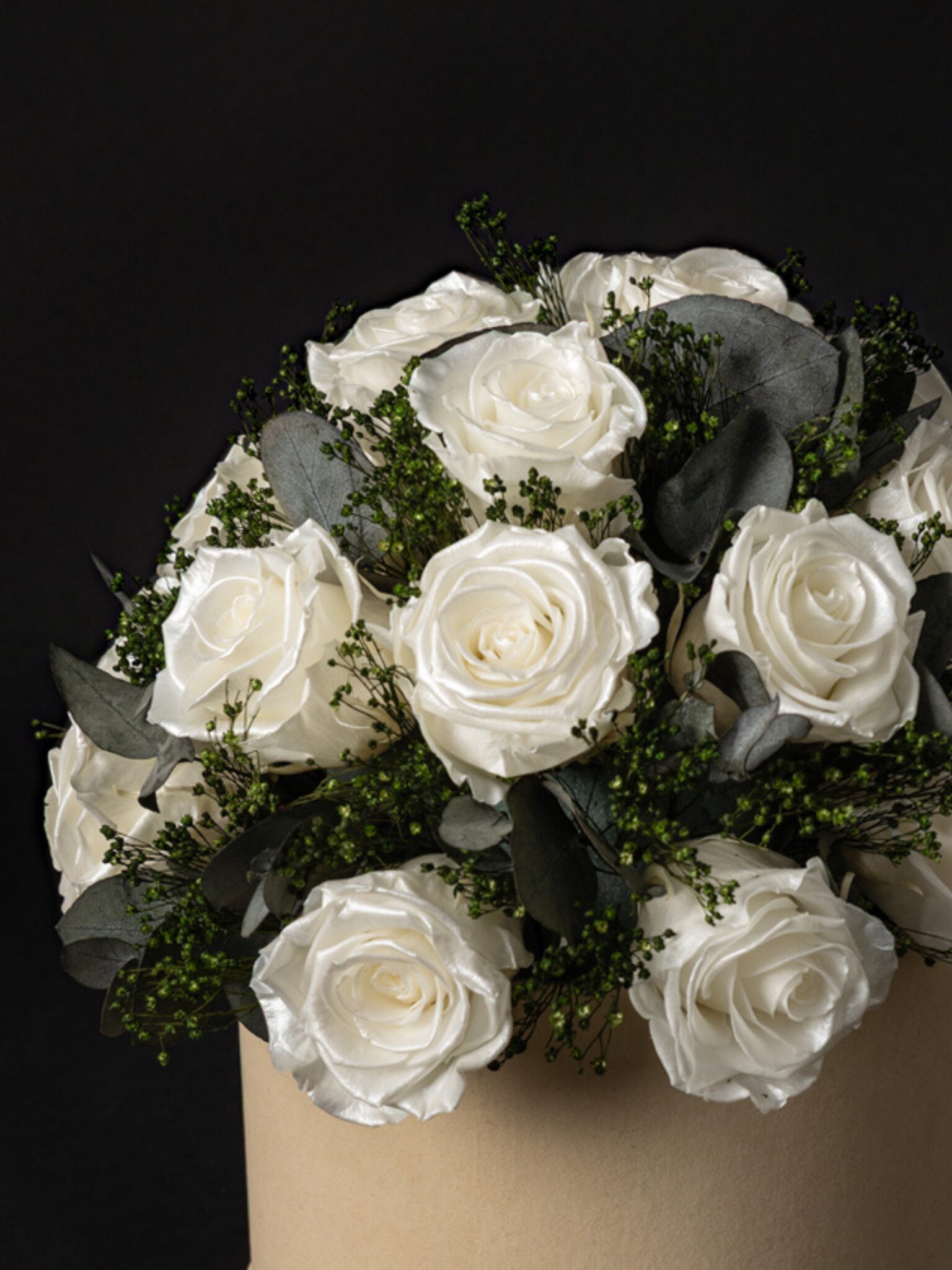 La Glamour Box Pearl Roses es la esencia del lujo y la sofisticación, una creación floral que combina la delicadeza de las rosas preservadas en tono perla con la frescura sutil de los verdes preservados, todo presentado en una elegante caja de 18 cm.