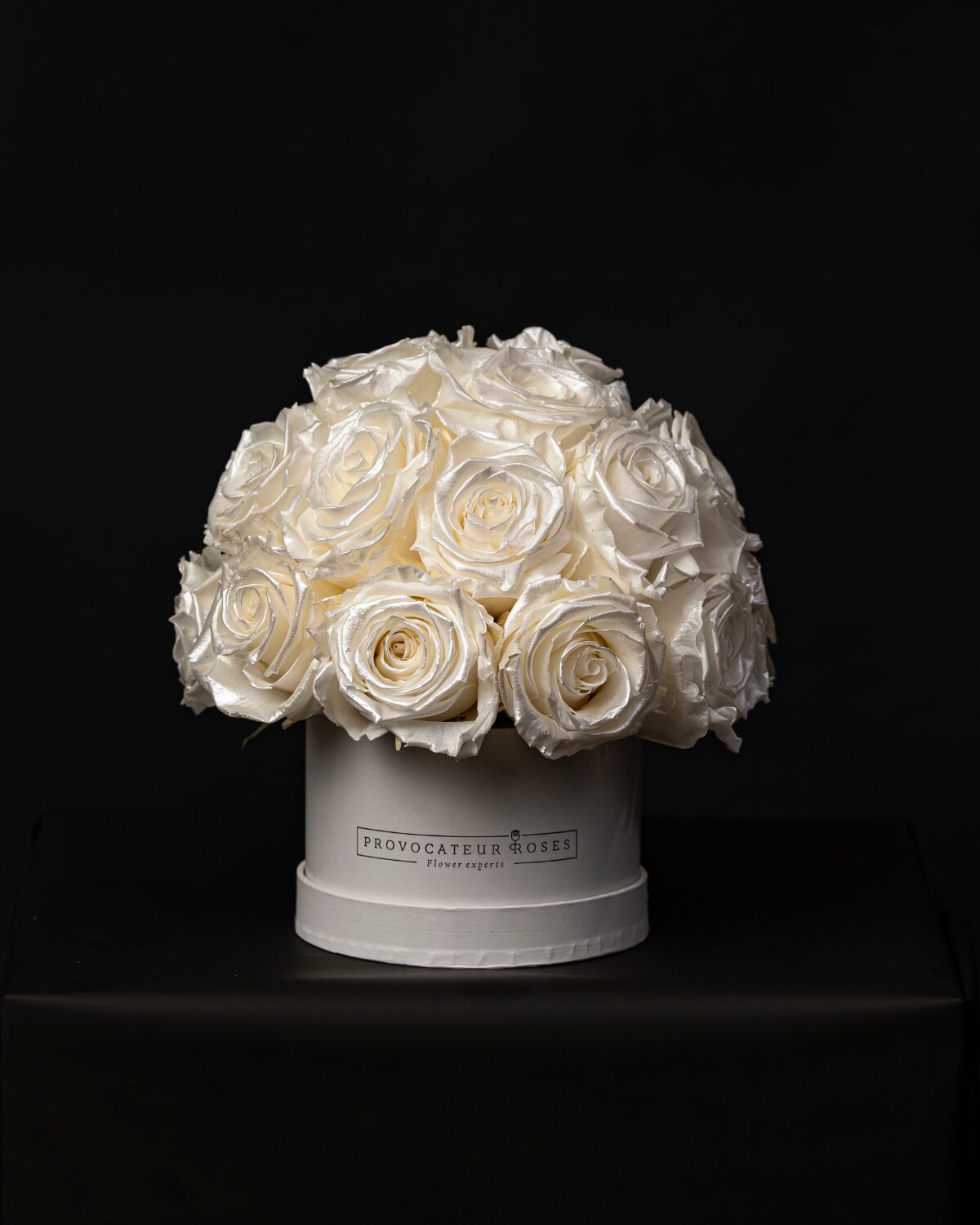 El contraste entre la caja blanca y el tono perla de las rosas realza su belleza natural, creando una pieza versátil que ilumina cualquier espacio con distinción.