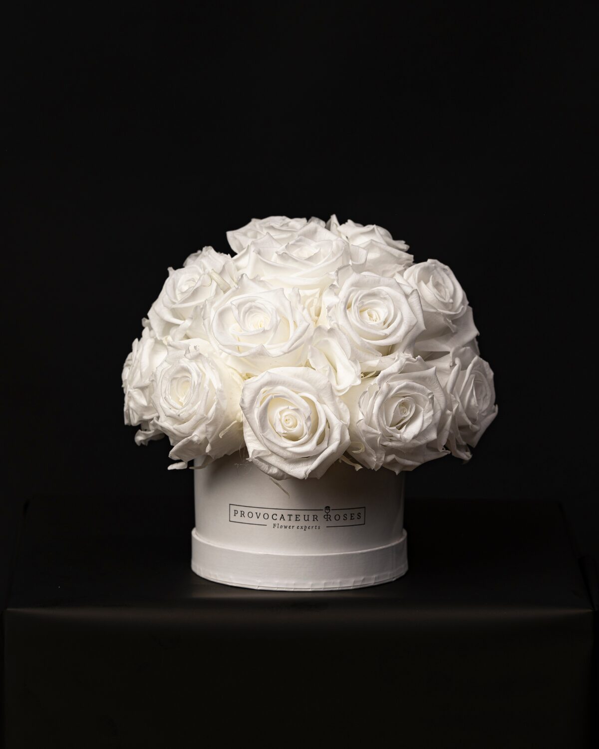 Un diseño refinado compuesto por 15 rosas eternas en color blanco, dispuestas en una elegante caja blanca. Una combinación que transmite armonía, luz y sofisticación atemporal.