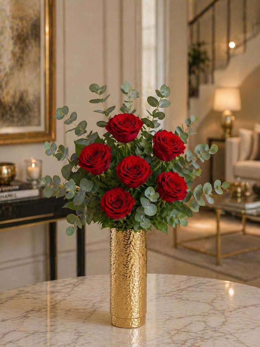 Composición de 6 rosas rojas, acompañadas de verdes elegantes, presentada con jarrón incluido. Un diseño equilibrado y sofisticado, pensado para regalar o decorar con un gesto sencillo y lleno de intención.