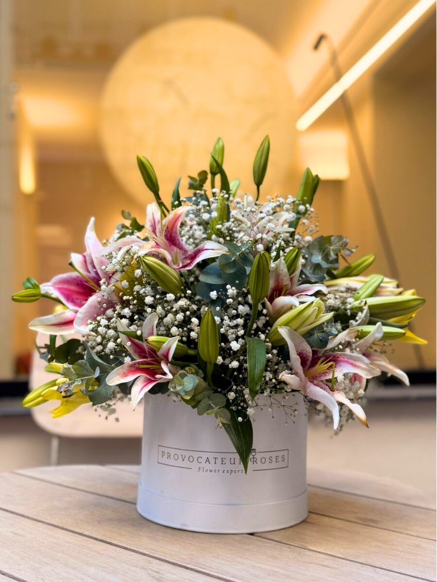 El color de los liliums puede variar según la temporada, manteniendo siempre una selección cuidada y armónica que respeta la esencia de la composición. Cada versión conserva el carácter exclusivo y refinado que define esta creación floral.