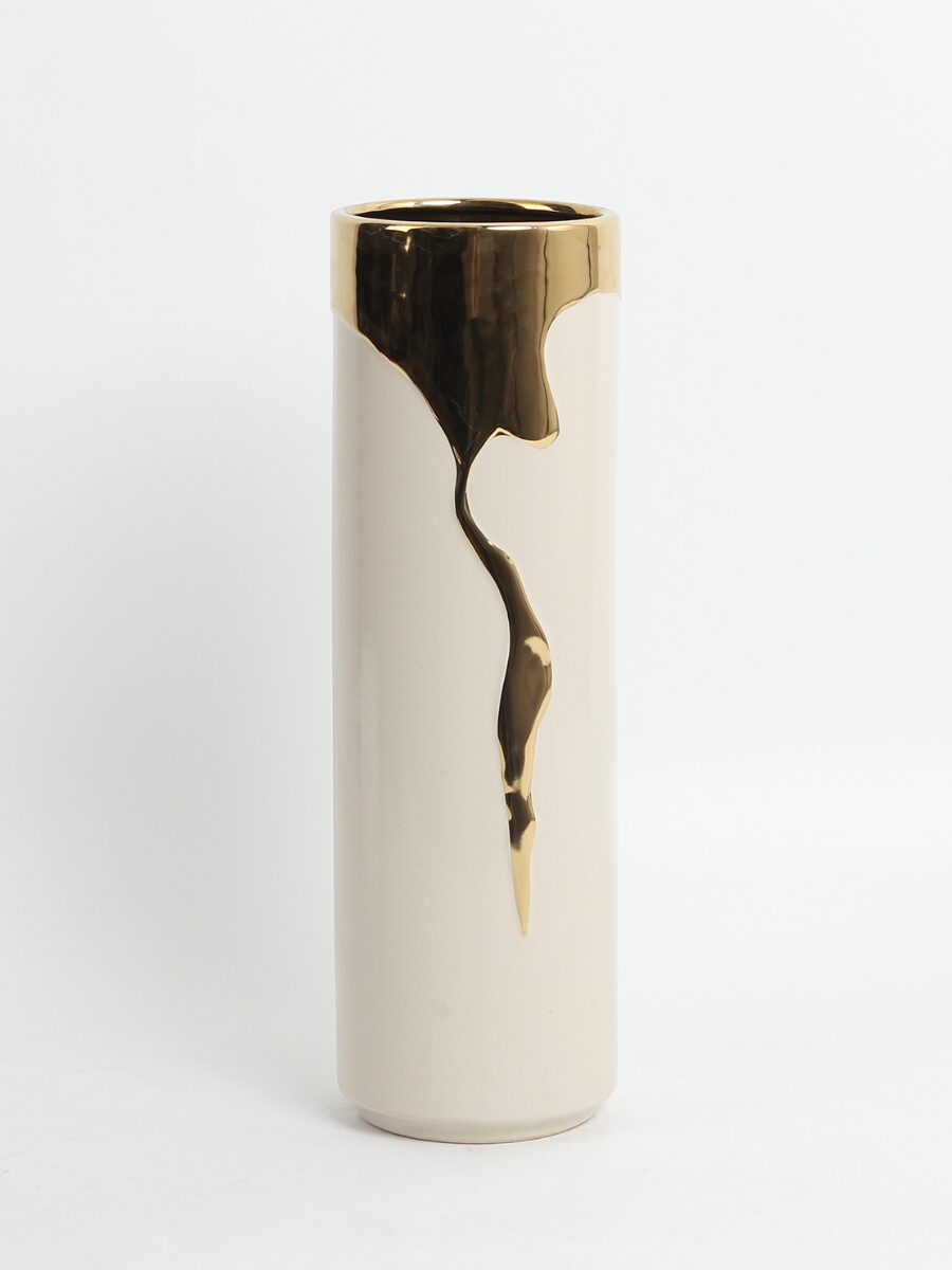 Jarrón decorativo de cerámica con acabado marfil satinado y un impactante detalle dorado de caída orgánica, diseñado para aportar altura, luminosidad y sofisticación contemporánea. Su silueta cilíndrica y estilizada, combinada con unas proporciones equilibradas —con unas medidas de 12,5 × 12,5 × 38,5 cm— lo convierten en una pieza ideal para flores de tallo largo, composiciones minimalistas o como elemento escultórico por sí solo.