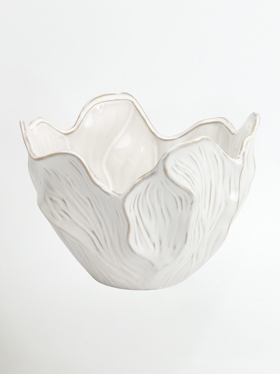 Jarrón decorativo de cerámica con una silueta orgánica y ondulada que evoca movimiento y ligereza visual. Su forma abierta y envolvente, junto a sus proporciones equilibradas —con unas medidas de 25,5 × 25,5 × 18 cm— lo convierten en una pieza ideal para composiciones florales amplias, centros de mesa elegantes o como elemento decorativo protagonista por sí solo.
