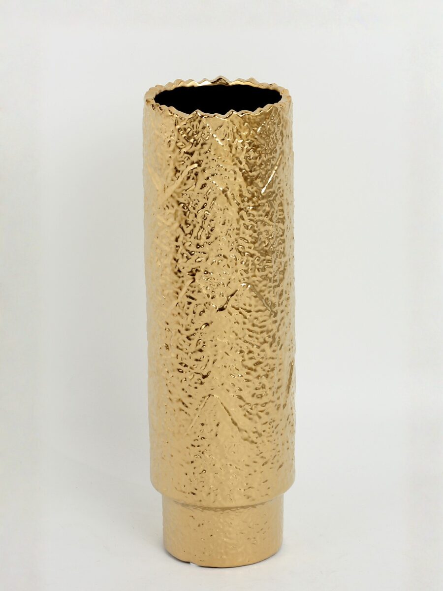 Jarrón decorativo de cerámica con acabado dorado texturizado y silueta vertical de líneas limpias, pensado para aportar presencia y sofisticación a espacios amplios. Su diseño cilíndrico estilizado y su superficie irregular capturan la luz con elegancia, mientras que sus proporciones —con unas medidas de 12 × 12 × 39 cm— lo convierten en una pieza ideal para composiciones florales altas o para destacar como elemento decorativo por sí solo.