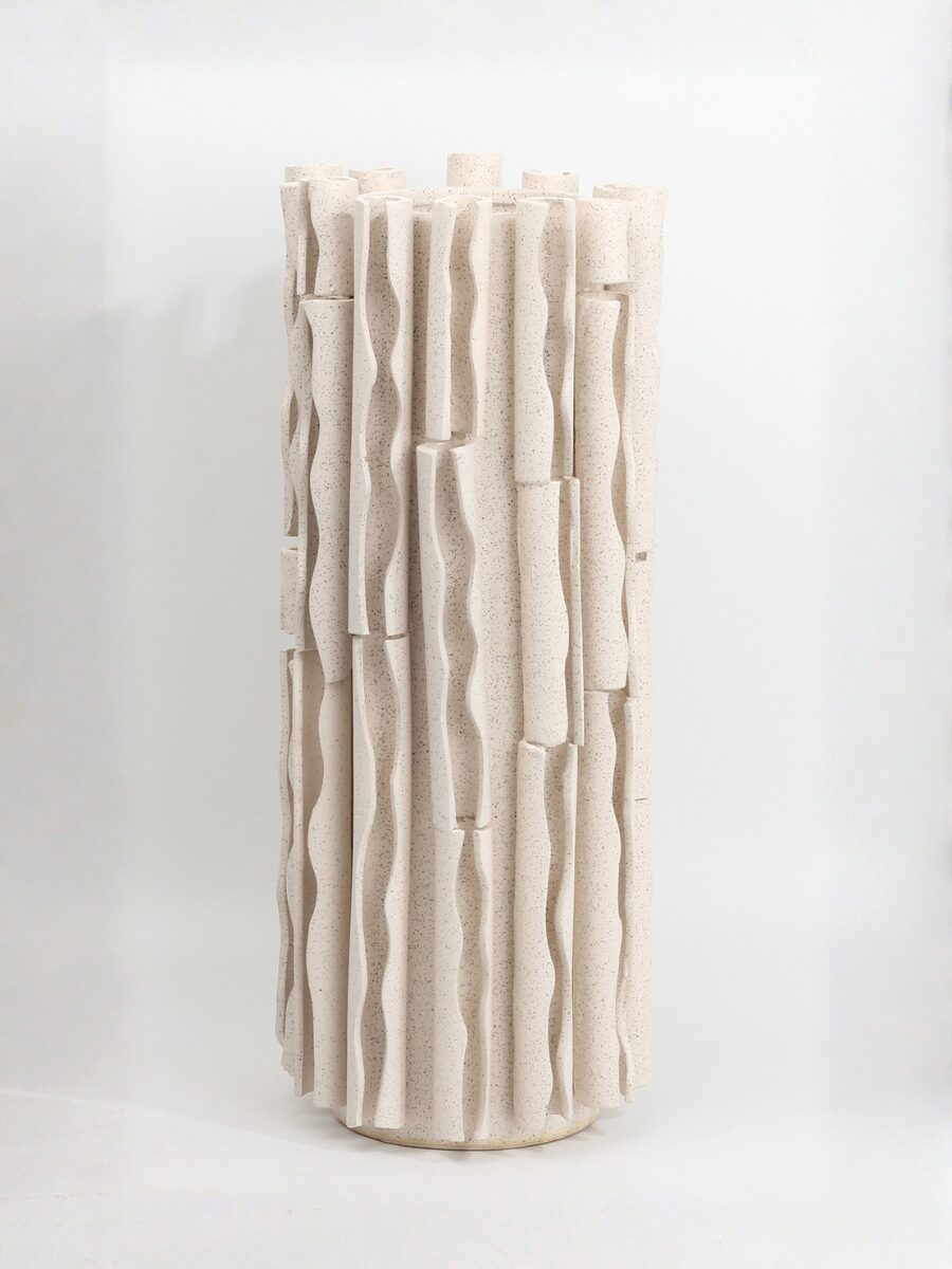Jarrón decorativo de cerámica con diseño vertical y relieve orgánico en módulos irregulares, que aporta textura, profundidad y una presencia escultórica muy marcada. Su silueta estilizada y su acabado natural lo convierten en una pieza protagonista, ideal para espacios amplios. Con unas medidas de 18,5 × 18,5 × 47 cm, destaca tanto con composiciones florales altas como como elemento decorativo por sí solo.