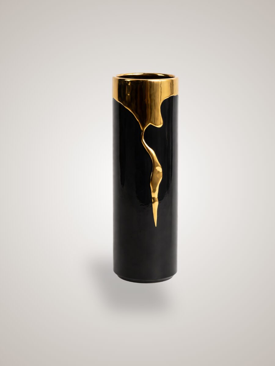 Jarrón de cerámica en acabado negro profundo con aplicación dorada escultórica. Una pieza decorativa de autor que combina sobriedad y lujo, diseñada para acompañar arreglos florales de alto nivel o destacar por sí sola.