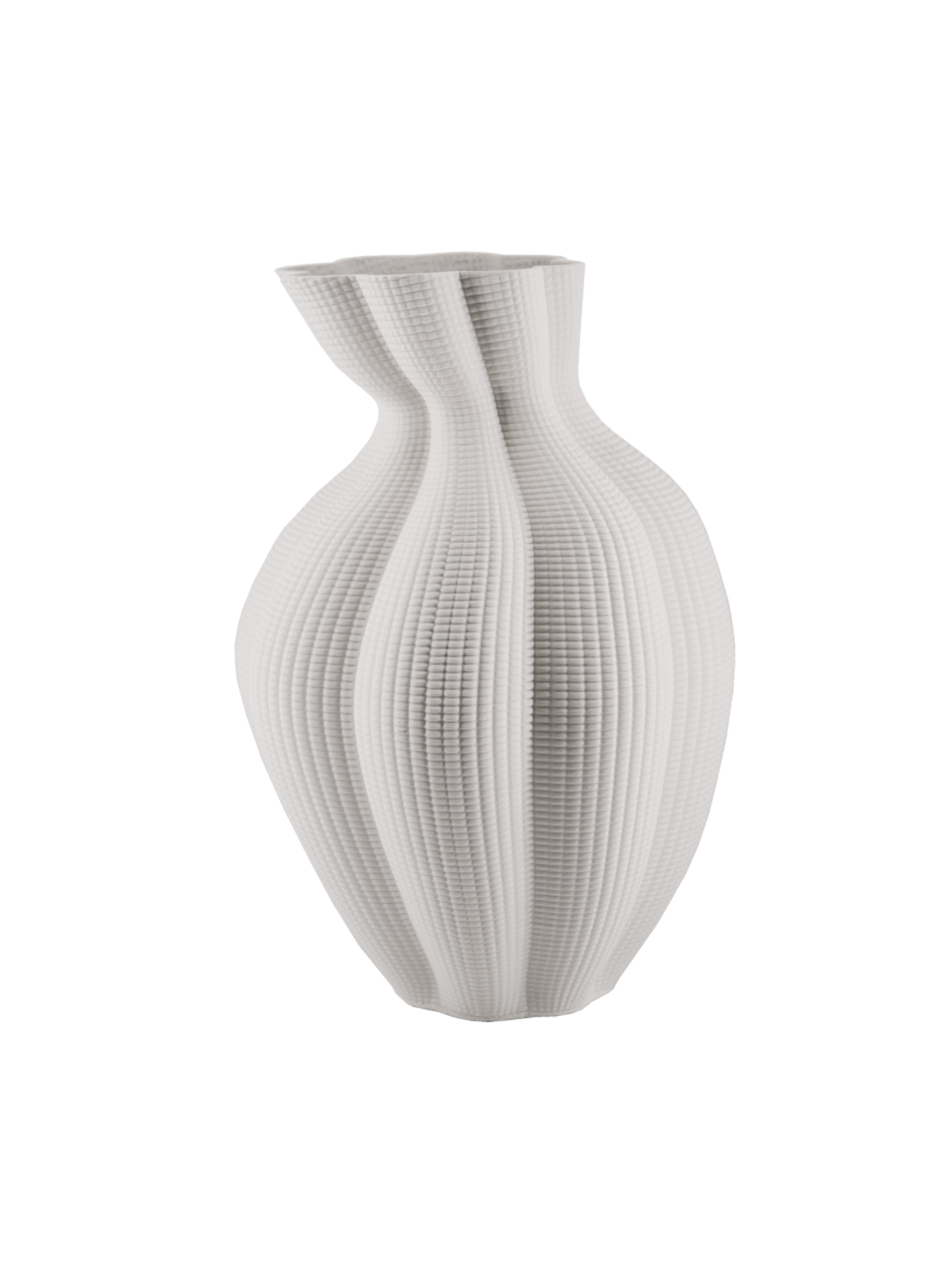 Fabricado en cerámica de alta calidad, este jarrón 3D combina tecnología y diseño para ofrecer una silueta moderna con un aire casi arquitectónico. Su acabado blanco mate y su forma estilizada lo convierten en un objeto de deseo para interiores sofisticados y creativos.
