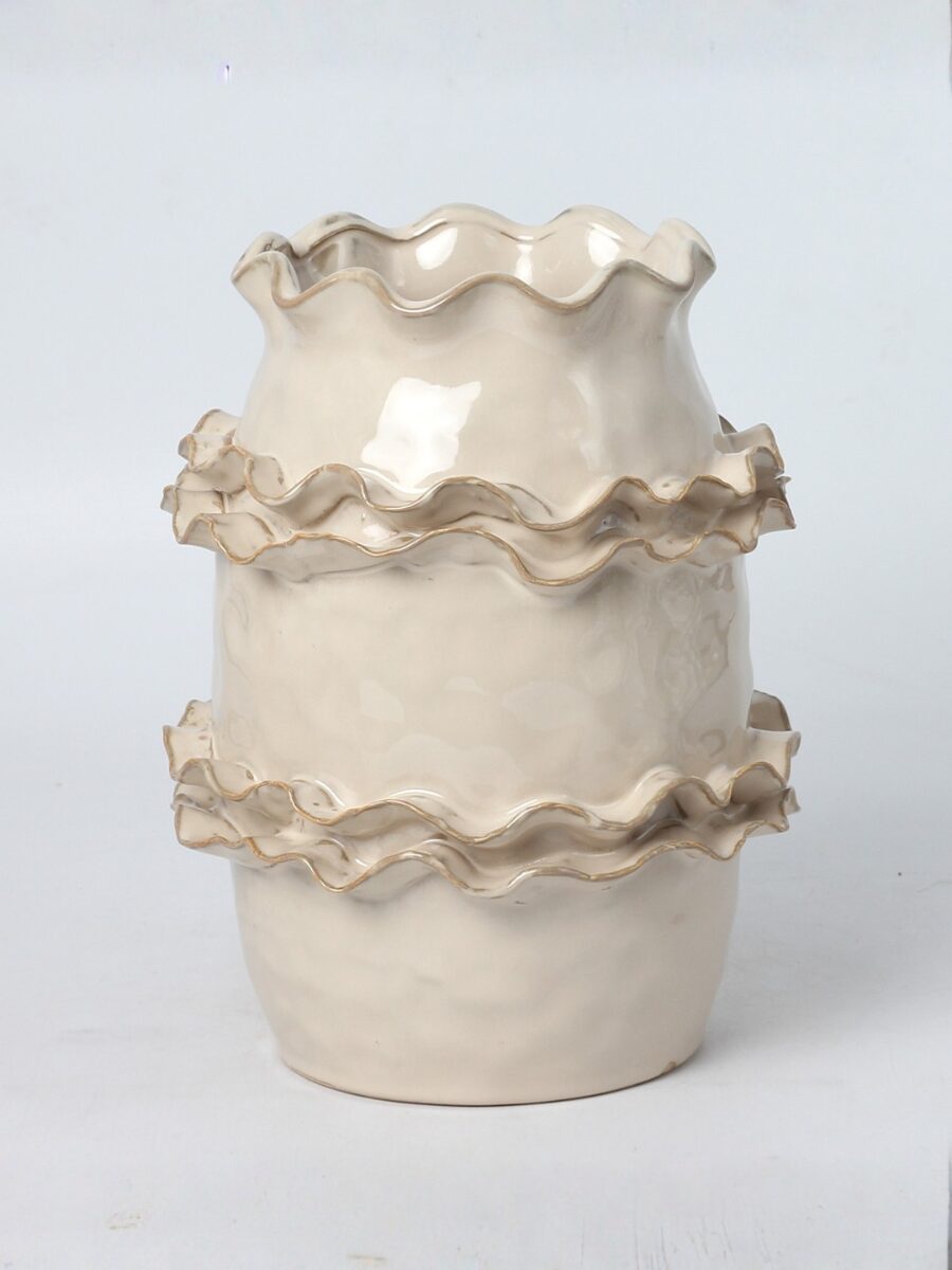 Un jarrón de volumen generoso y bordes ondulados que aporta movimiento y suavidad visual. Con una presencia equilibrada de 28 cm de altura y 21 cm de diámetro, es ideal para arreglos florales abundantes y composiciones con cuerpo.