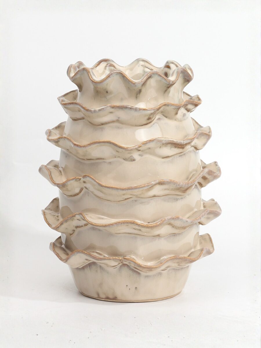 Un jarrón de proporciones equilibradas, con 20,5 cm de altura y 15,5 cm de diámetro, que destaca por su diseño ondulado y su fuerte presencia decorativa.