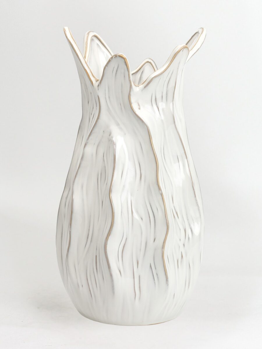 Jarrón decorativo de cerámica con una silueta orgánica y ondulada, realzada por finos perfiles dorados que recorren su superficie de forma natural y fluida. Su diseño vertical y escultural, junto a unas proporciones equilibradas de 21 × 20,5 × 40 cm, lo convierten en una pieza protagonista, ideal para arreglos florales de gran presencia o para destacar como objeto decorativo por sí solo en espacios amplios y luminosos.