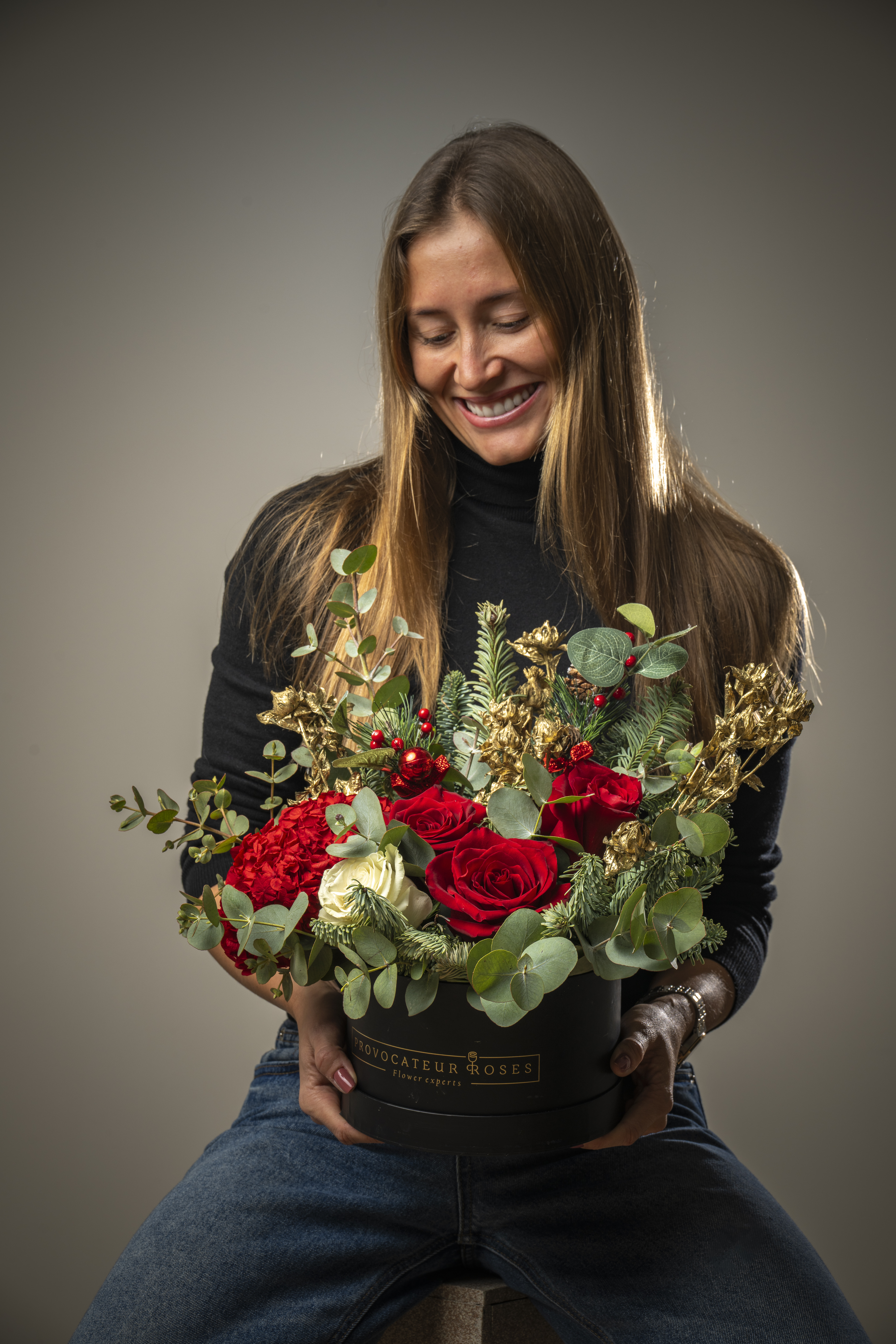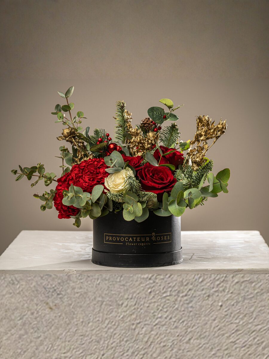 Este arreglo reúne rosas rojas aterciopeladas, símbolo de amor y celebración, junto a una delicada rosa blanca premium que aporta luz y equilibrio. La intensidad de la hortensia roja añade profundidad y volumen, mientras el eucalipto fresco y las ramas de abeto natural evocan la esencia del invierno.