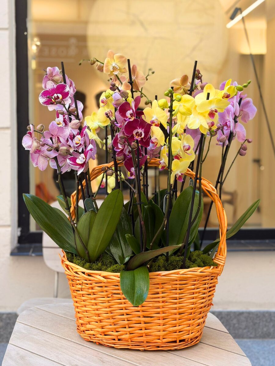 Una cesta de diseño que reúne una selección de orquídeas premium en una composición floral elegante, llena de matices y color. Un regalo con flores pensado para sorprender y transmitir sofisticación en cada detalle.