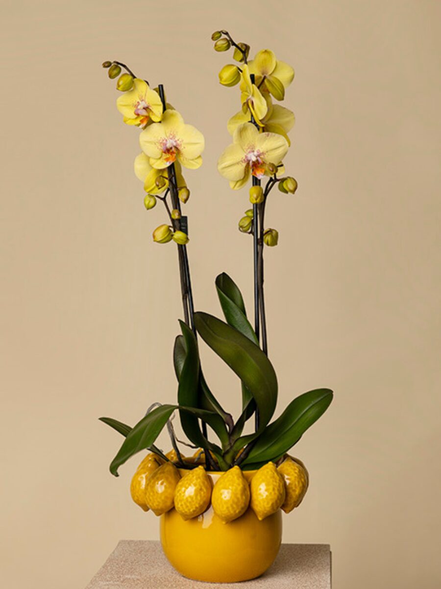 El amarillo intenso de la orquídea, con su forma delicada y exótica, aporta una sensación de alegría y vitalidad. Su contraste con el acabado brillante del jarrón lima pequeño crea un equilibrio perfecto entre naturalidad y diseño contemporáneo. El resultado: una pieza fresca, original y visualmente muy atractiva.