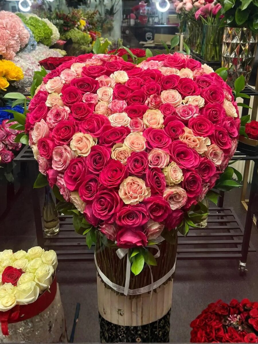 Un exclusivo arreglo floral en forma de corazón, compuesto por 170 rosas frescas en tonos rosas y fucsia. Este diseño elegante y romántico es perfecto para transmitir amor y afecto en cualquier ocasión especial. Las flores están cuidadosamente dispuestas para crear un impacto visual inolvidable, ideal como centro de atención o regalo único.