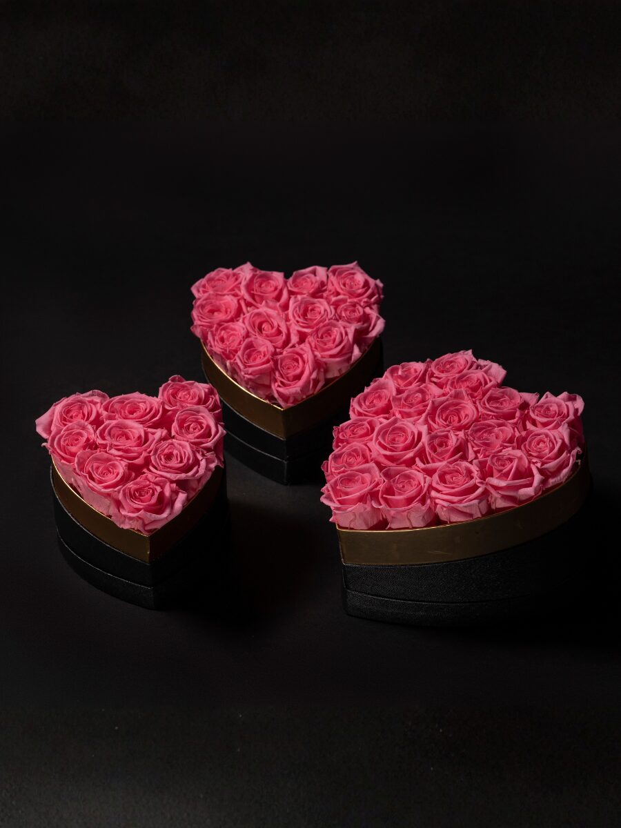 Caja de Rosas en Forma de Corazón: Elegante caja en forma de corazón con rosas frescas rosas, disponible en 3 tamaños. Ideal para expresar amor y sofisticación.