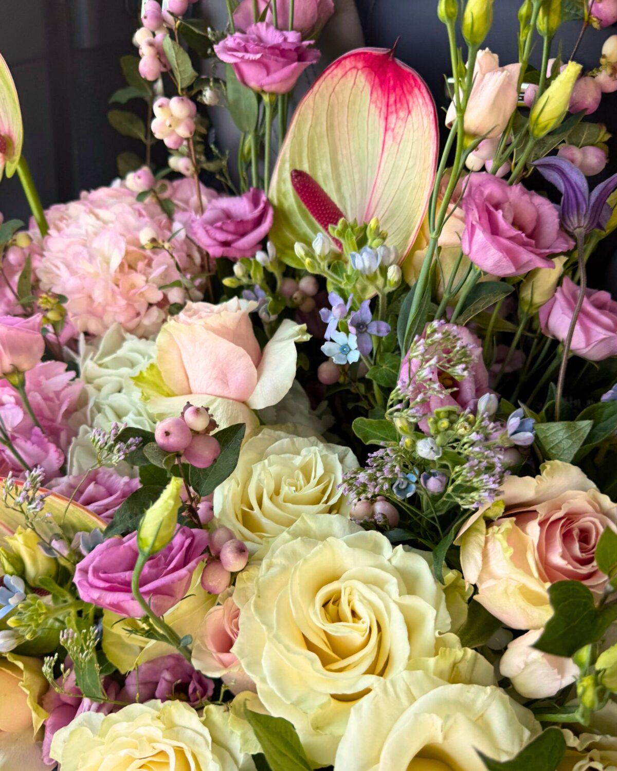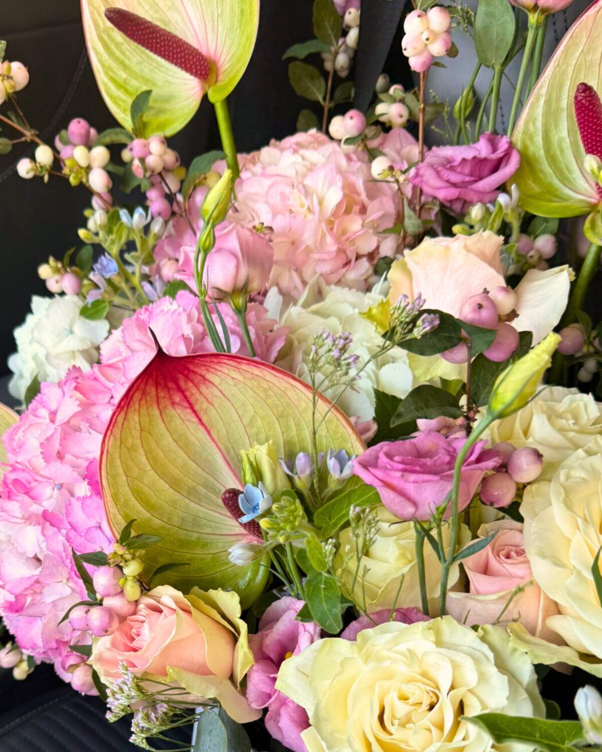Cada flor aporta su propio carácter: el anthurium con su toque exótico, la hortensia con volumen y ternura, las rosas y lisianthus con romanticismo, mientras que la clemátide y el oxypetalum añaden frescura y un aire delicado. Los eucaliptos cierran la composición con un contraste verde que realza todo el conjunto.
