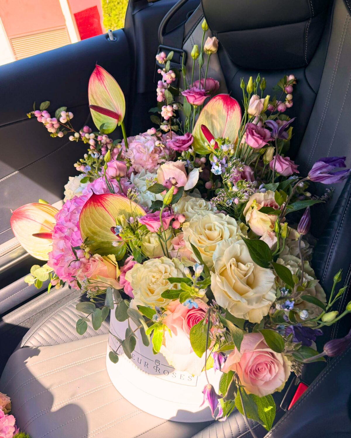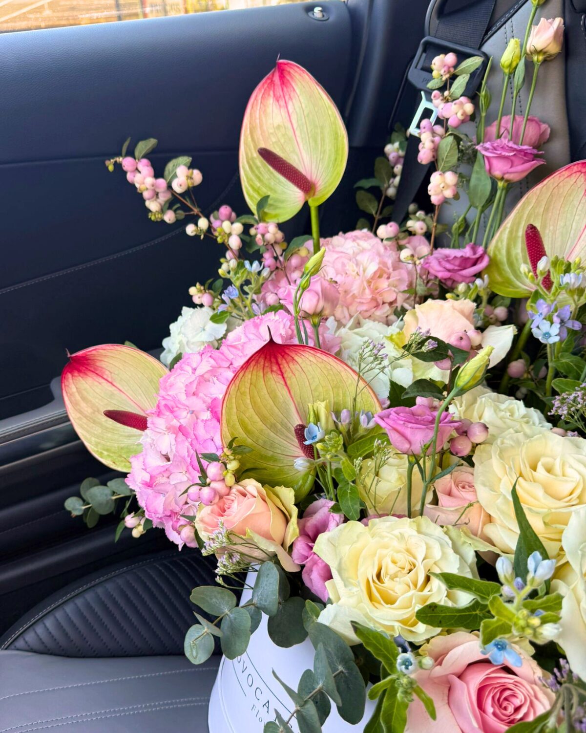 Una caja blanca de 22 cm que reúne flores únicas en una composición vibrante y sofisticada. Con anthurium, hortensias, rosas, lisianthus, eucaliptos, clemátide y oxypetalum, esta creación transmite encanto, delicadeza y un estilo atemporal que enamora a primera vista.