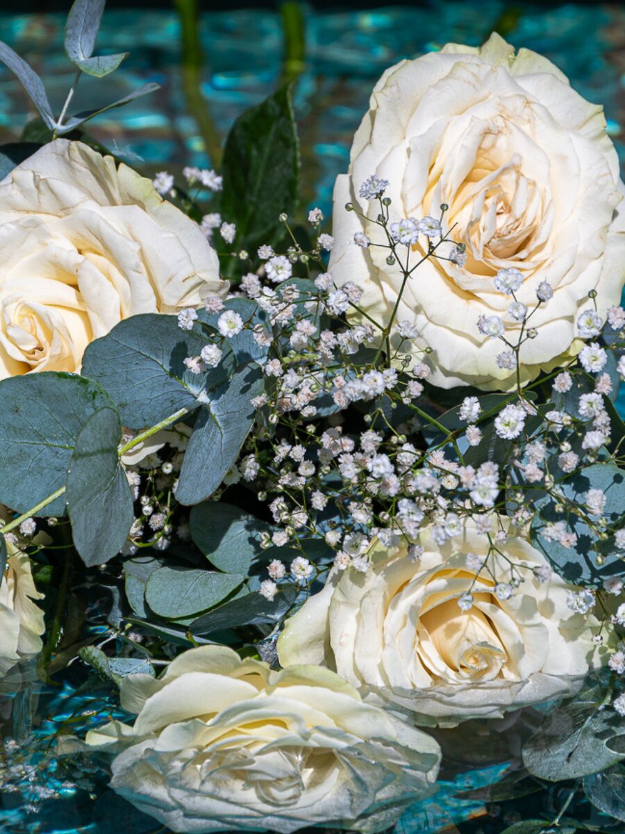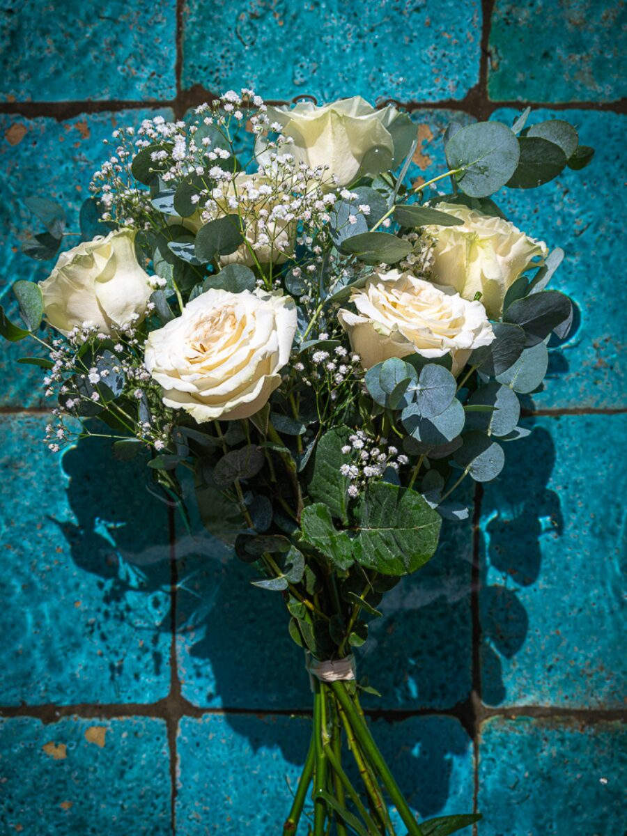 Puro, elegante y siempre acertado. Este ramo combina la belleza atemporal de las rosas blancas con la ligereza de la paniculata y el frescor del eucalipto. Una elección que transmite paz y emociones sinceras.