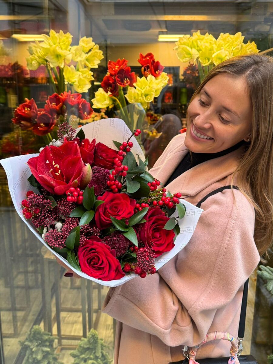 Una mezcla cálida y sofisticada donde el amarilis rojo, las rosas premium y los detalles festivos de ilex y flores de temporada crean un diseño vibrante, elegante y lleno de vida.
