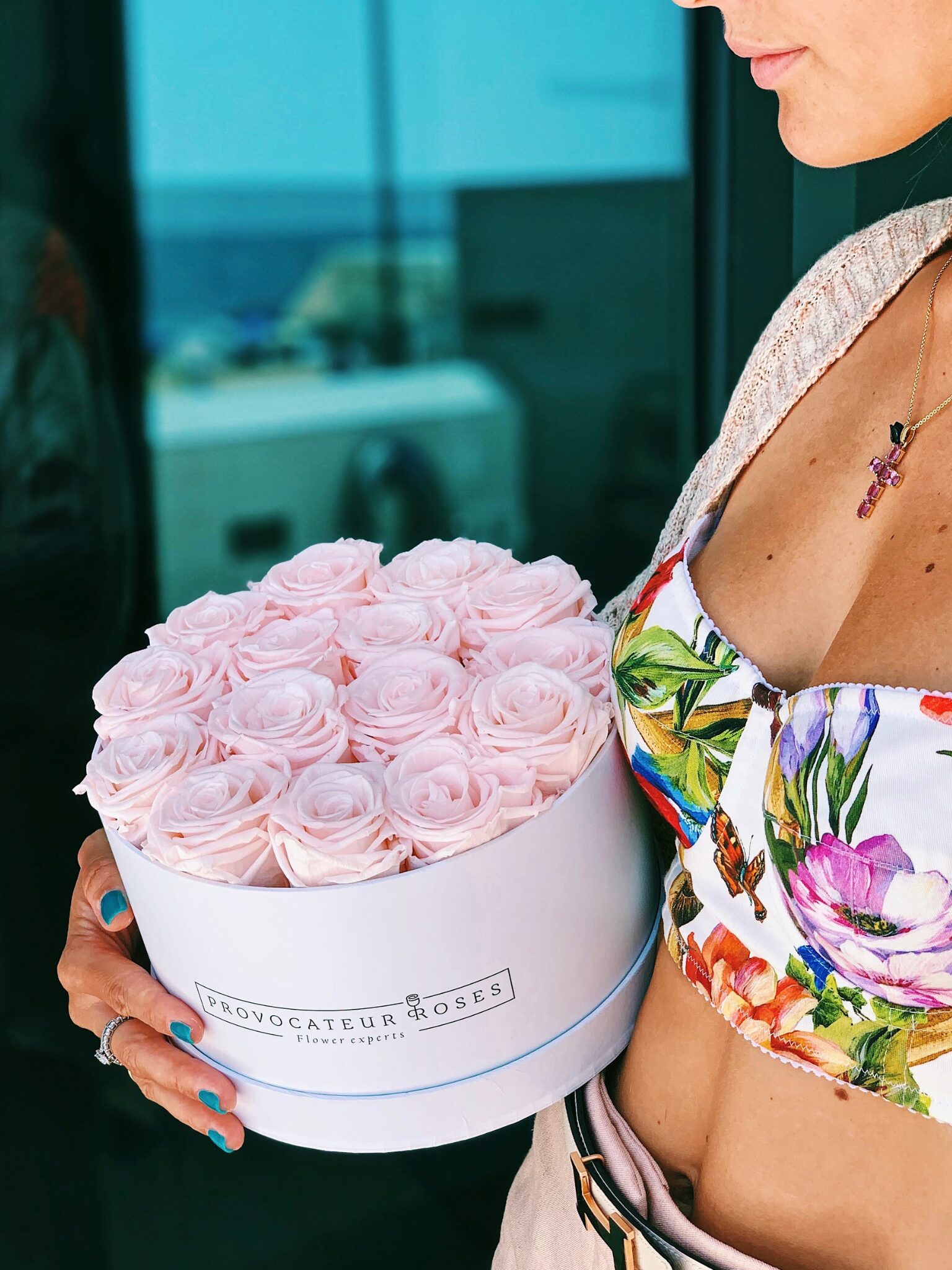 Caja redonda de 30cm con 29-32 rosas aprox con rosas eternas de duración de 5 años en color Pink Blush. Disponible en varios tamaños y colores.