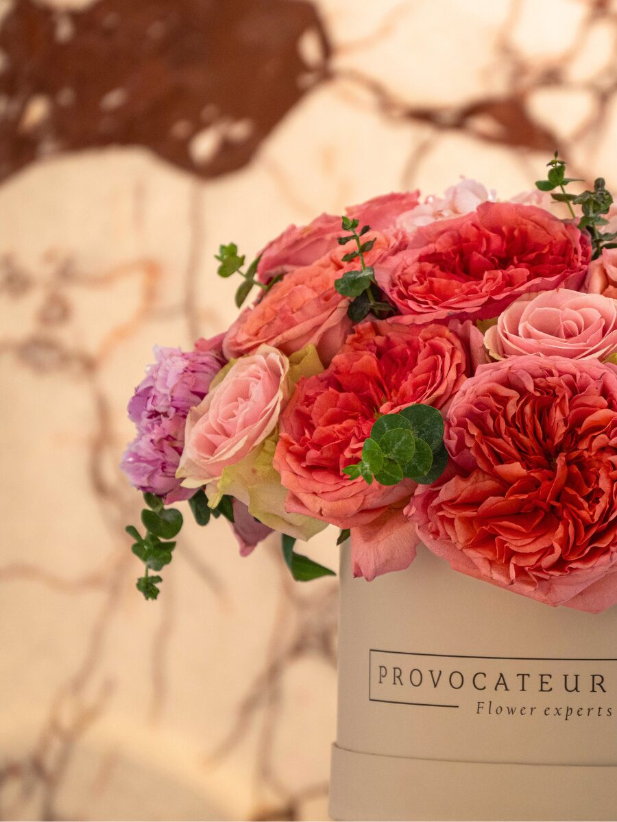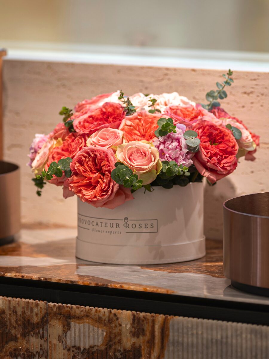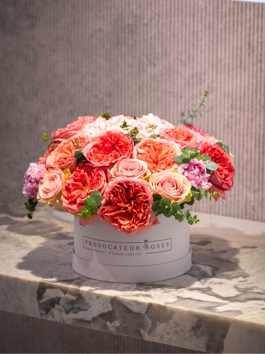 Una caja blanca de 22 cm que reúne la delicadeza y fuerza de rosas pink expression, rosas frutteto y peonías, acompañadas de verdes que aportan frescura y equilibrio.