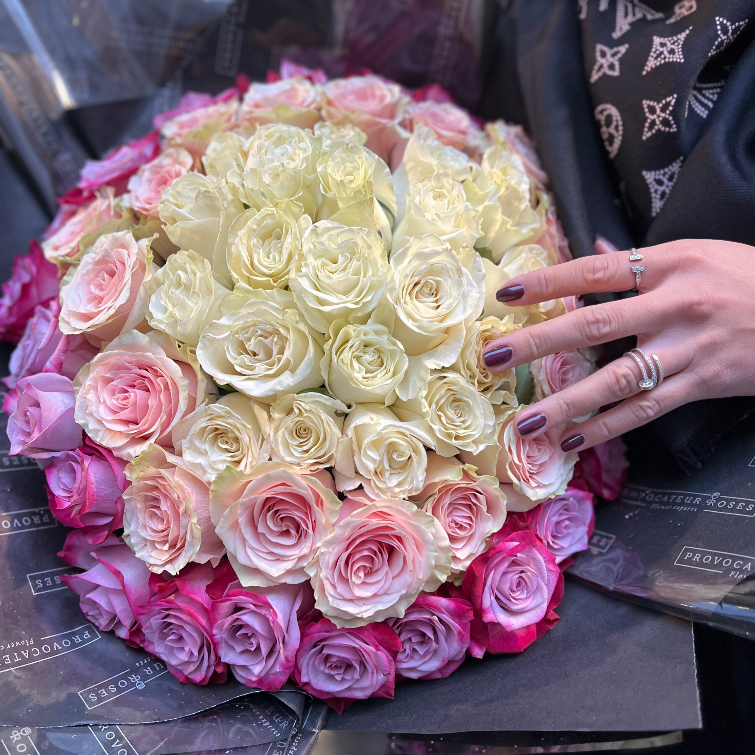 Sumérgete en la armonía de este bouquet cautivador, donde la pureza de las rosas blancas se funde con la dulzura de las rosadas y el toque enigmático de las moradas. Cada flor, cuidadosamente seleccionada, irradia elegancia, romanticismo y un aire de misterio, convirtiendo al conjunto en un símbolo de amor, belleza y momentos inolvidables. Su suave paleta cromática y sus texturas lujosas realzan la gracia y el encanto de este arreglo, ideal como centro de atención o como regalo lleno de significado.
