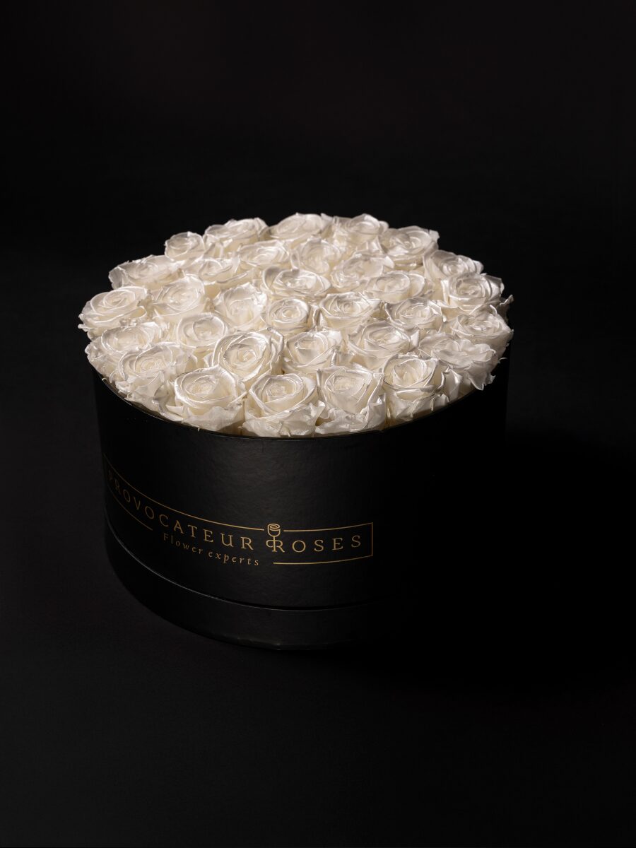 La elegancia en su máxima expresión. Esta caja redonda de edición limitada contiene rosas eternas en un exclusivo color perlado, símbolo de pureza y sofisticación. Con unidades limitadas, es el regalo perfecto o el detalle decorativo ideal para destacar en cualquier ocasión. ¡Adquiérela antes de que se agoten!