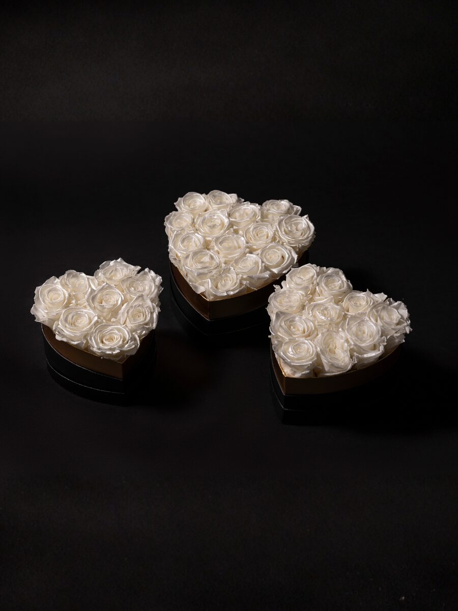 Edición limitada de Caja de Rosas en Forma de Corazón: Elegante caja en forma de corazón con rosas preservadas en el color exclusivo blanco perla, disponible en 3 tamaños. Ideal para expresar amor eterno y sofisticación